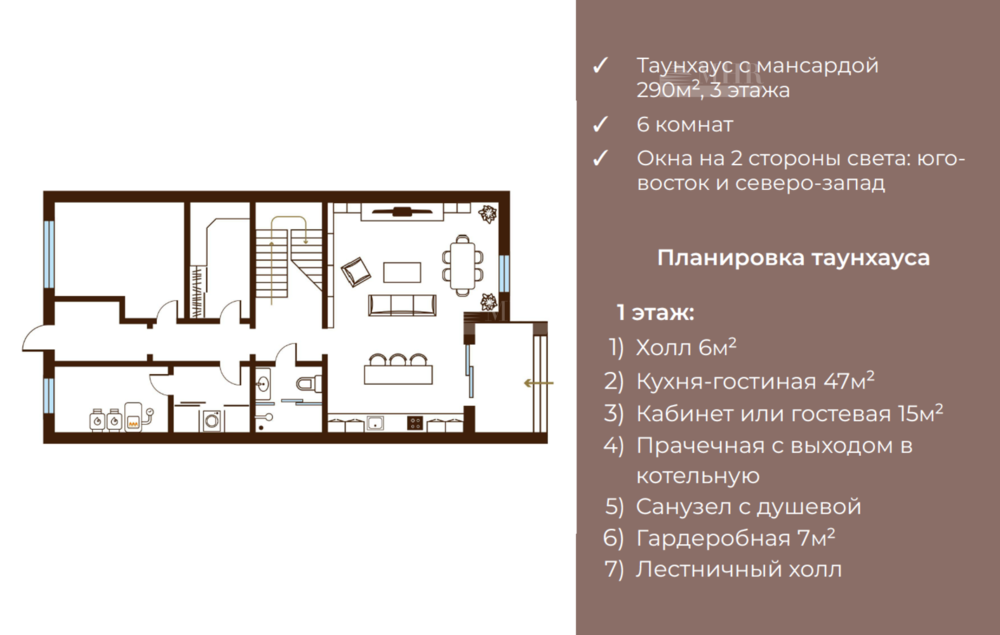 1-й этаж: холл, кухня-гостиная, кабинет или гостевая, прачечная с выходом в котельную, санузел с душевой, гардеробная, лестничный холл;