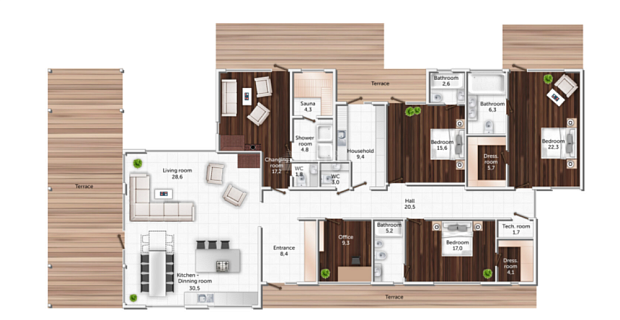 1-й этаж: прихожая, просторная кухня-гостиная, гостевая спальня, с/у с душевой, прачечная, выход на зону барбекю;