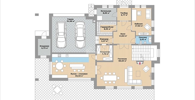 1 этаж: 3 выхода на террасу, гостиная, гостиная с камином, кабинет, комната для персонала, кухня, 2 с/у, гараж на 2 м/м;