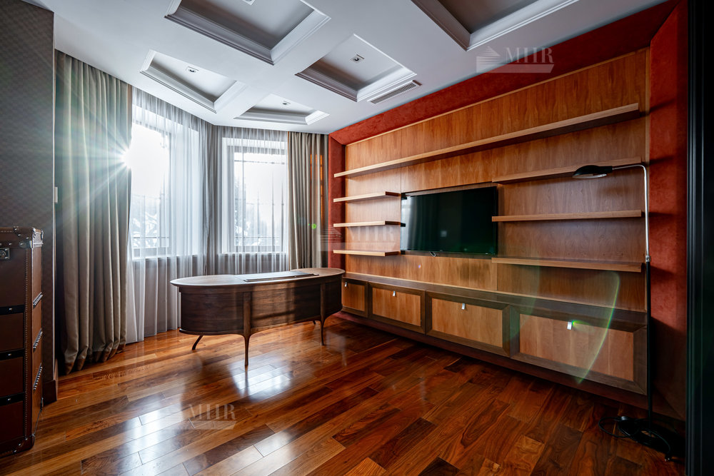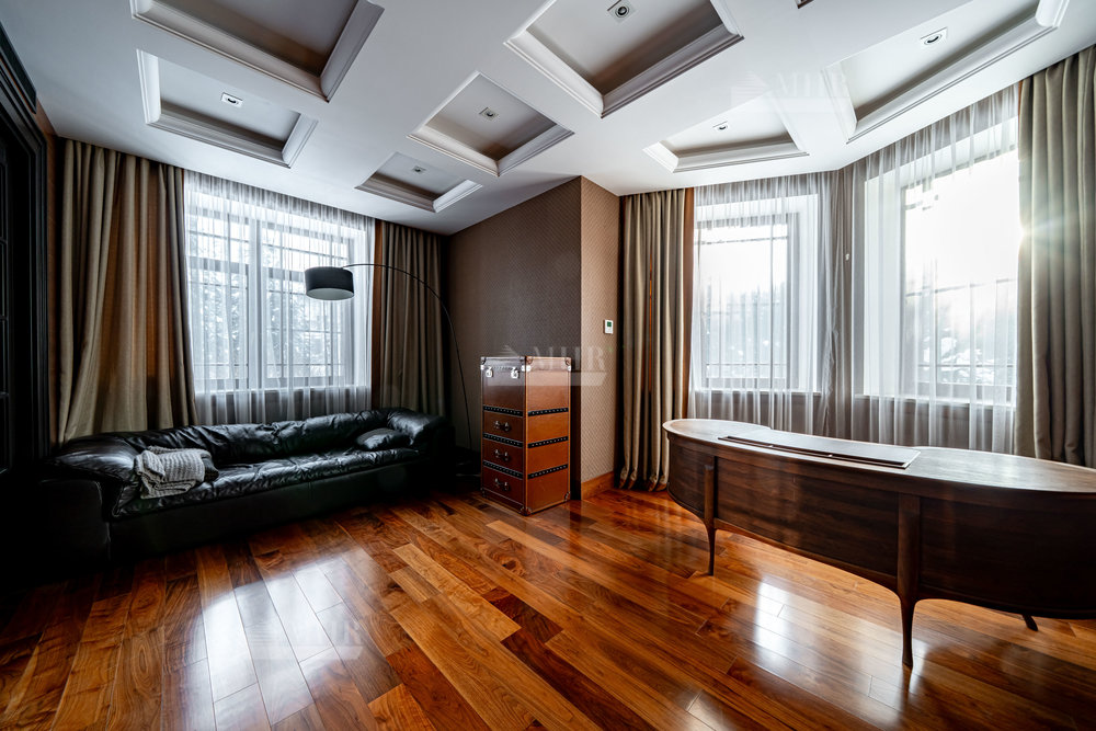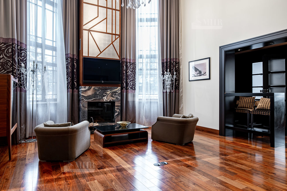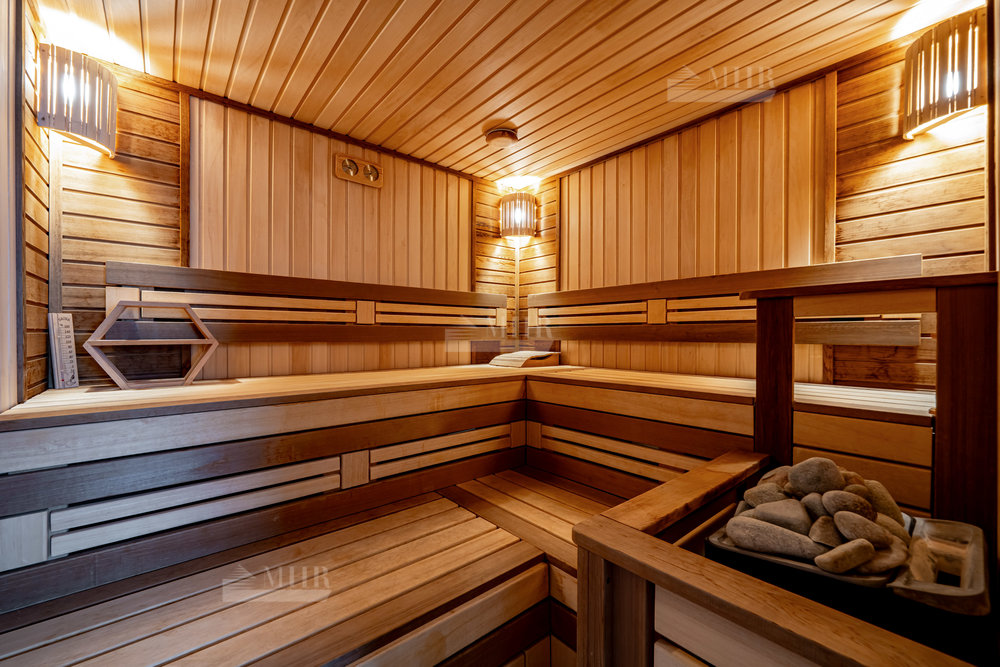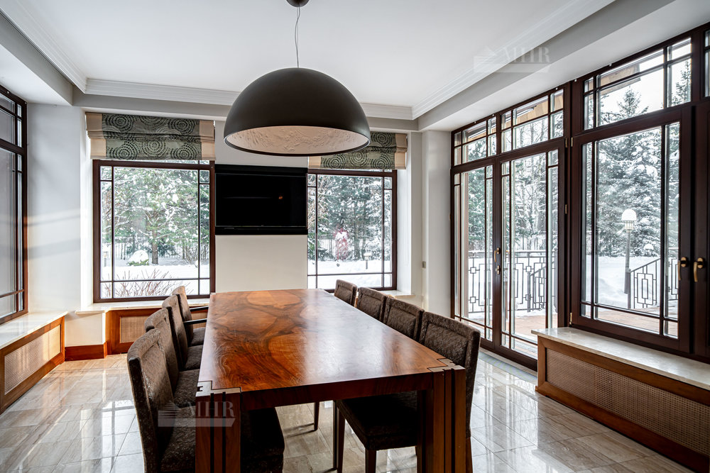 1-й этаж: двухсветная гостиная с камином и витражным остеклением, столовая с выходом на крытую террасу, зимний сад с панорамными окнами, кабинет, гостевая спальня, СПА-зона с сауной и комнатой отдыха с мини-кухней;