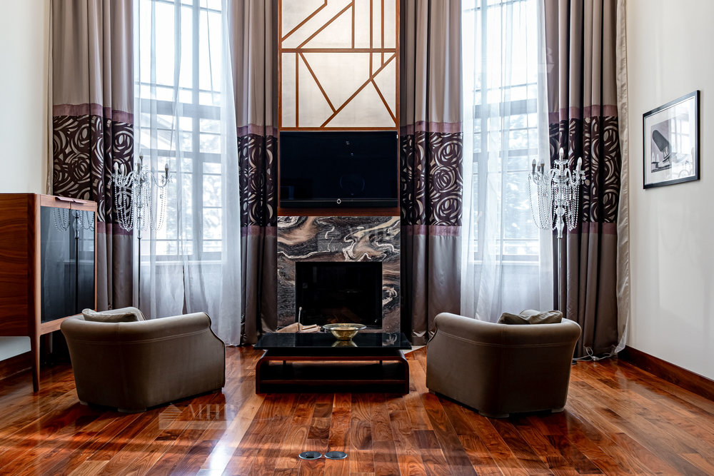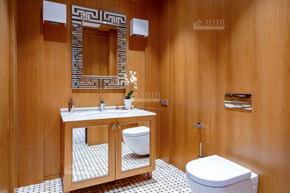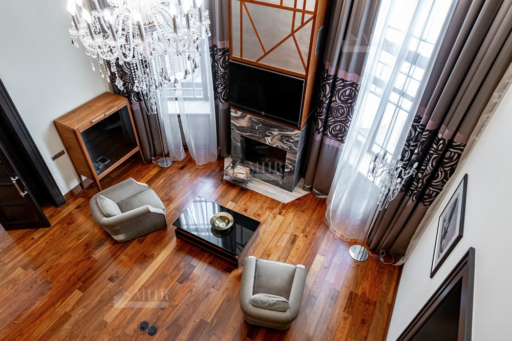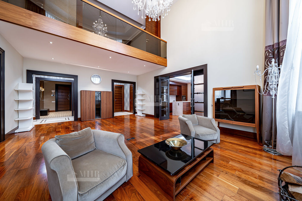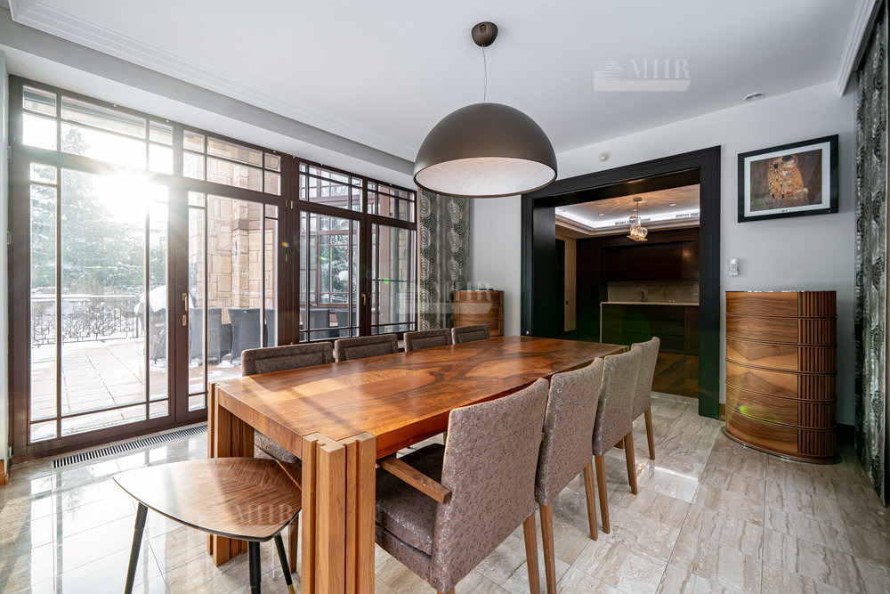 1-й этаж: двухсветная гостиная с камином и витражным остеклением, столовая с выходом на крытую террасу, зимний сад с панорамными окнами, кабинет, гостевая спальня, СПА-зона с сауной и комнатой отдыха с мини-кухней;