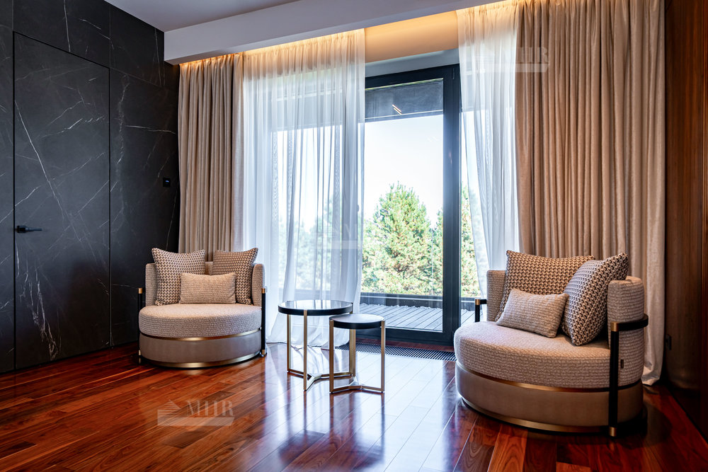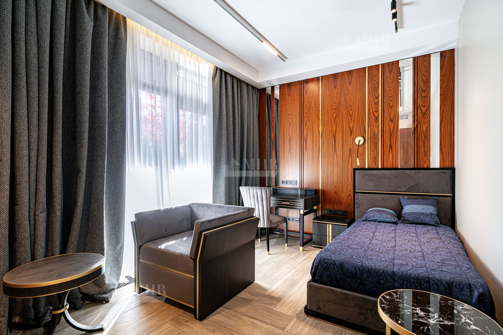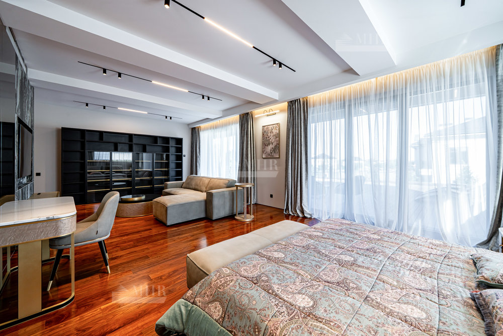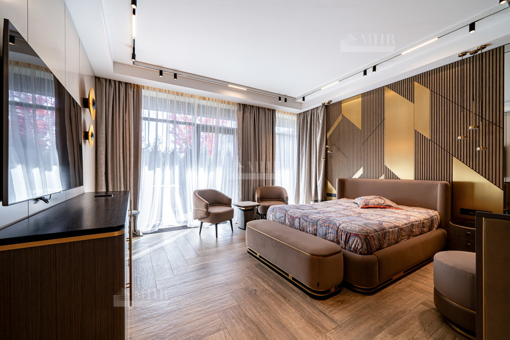 2-й этаж: мастер-спальня с гостиной зоной, гардеробной и с/у, спальня с с/у и гардеробной, кабинет( либо дополнительная спальня).Гостевой блок с отдельным входом, с кухней-столовой, спальней, с/у и гардеробной.