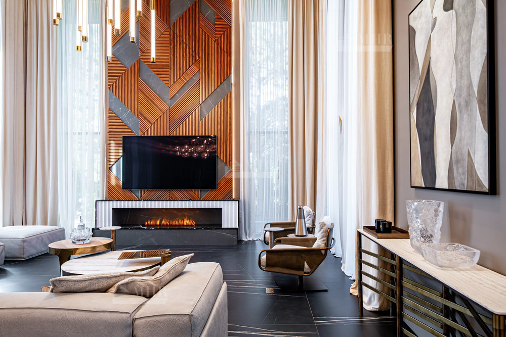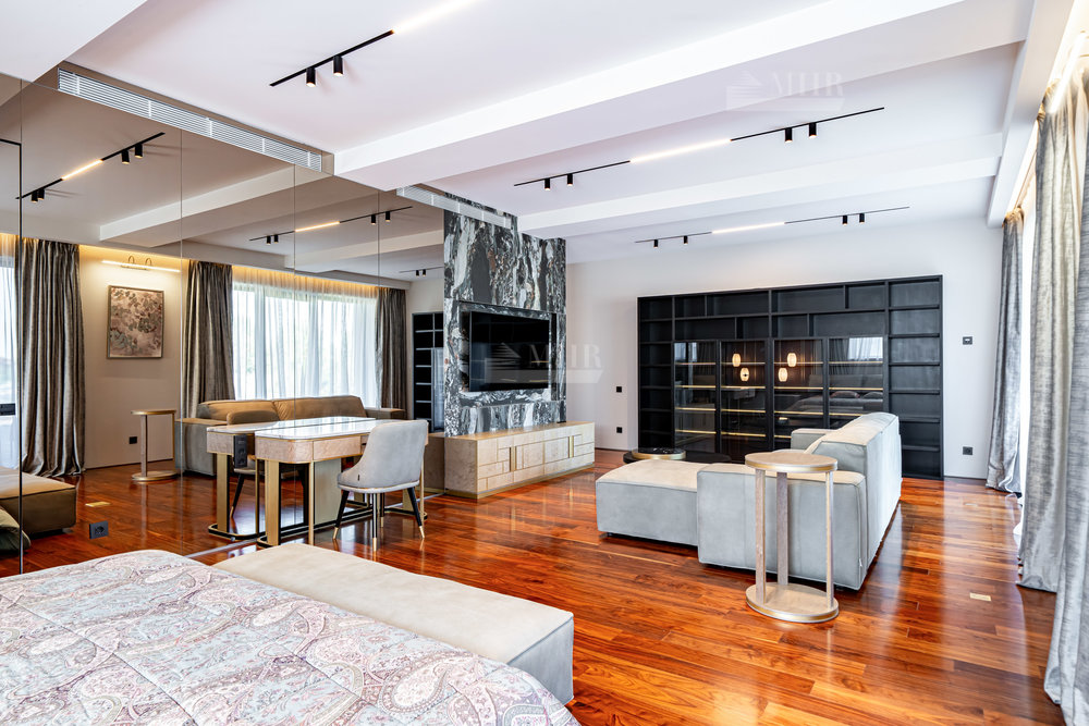 1-й этаж: кухня, столовая, гостиная с камином, 2 спальни с собственными гардеробными  и санузлами, гараж, СПА-зона;