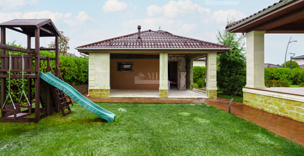 Двухэтажный особняк в классическом стиле. На участке расположена отапливаемая беседка (60м2) и гараж на 2 м/м с квартирой для персонала на втором этаже. Строения возведены из кирпича, отделка фасада выполнена из песчаника, кровля из натуральной черепицы. Домостроение расположено в очень выгодном месте, соседи построились. Свободная планировка дома позволяет осуществить любые Ваши фантазии. Далее приведен пример возможной планировки.