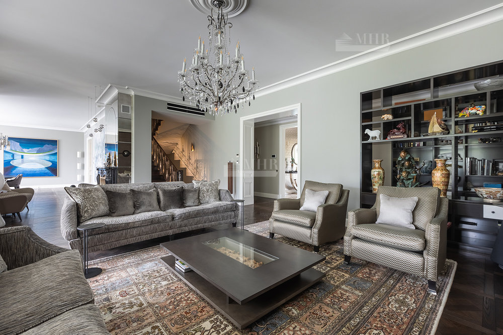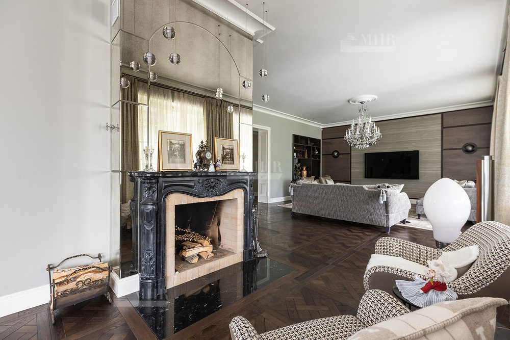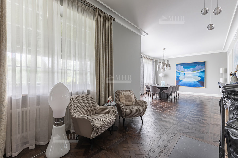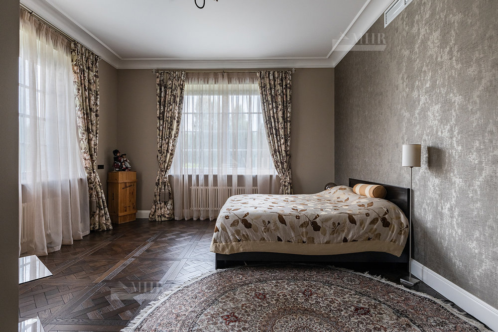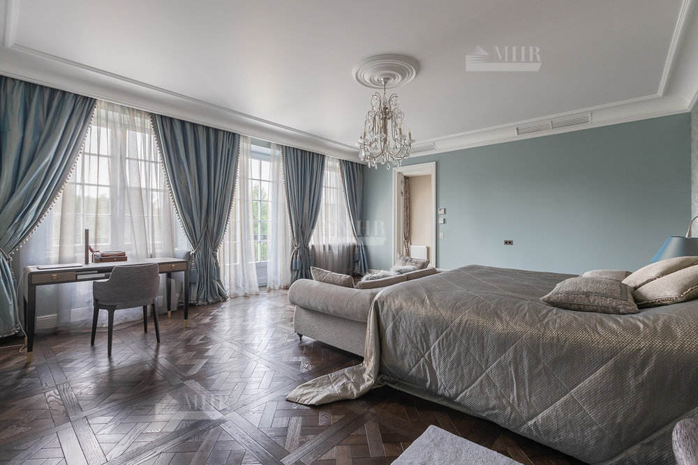 Из окон гостиной и мастер-спальни открывается потрясающий вид на парковый ландшафт участка в окружении зелени лиственных и хвойных деревьев. Имеется свой выход в парк.