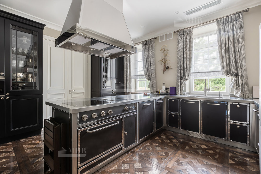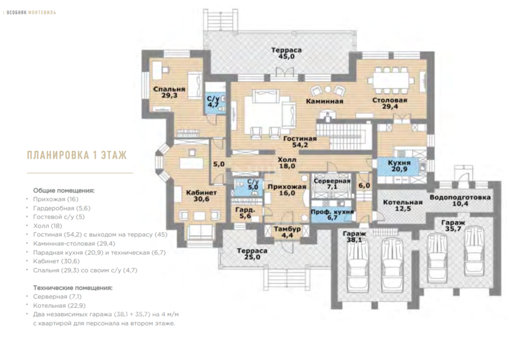 1й этаж: прихожая, гардеробная, гостевой с/у, холл, гостиная с выходом на террасу, каминная-столовая, парадная кухня и техническая, кабинет, спальня со своим с/у, серверная, котельная, два независимых гаража с квартирой для персонала на втором этаже;