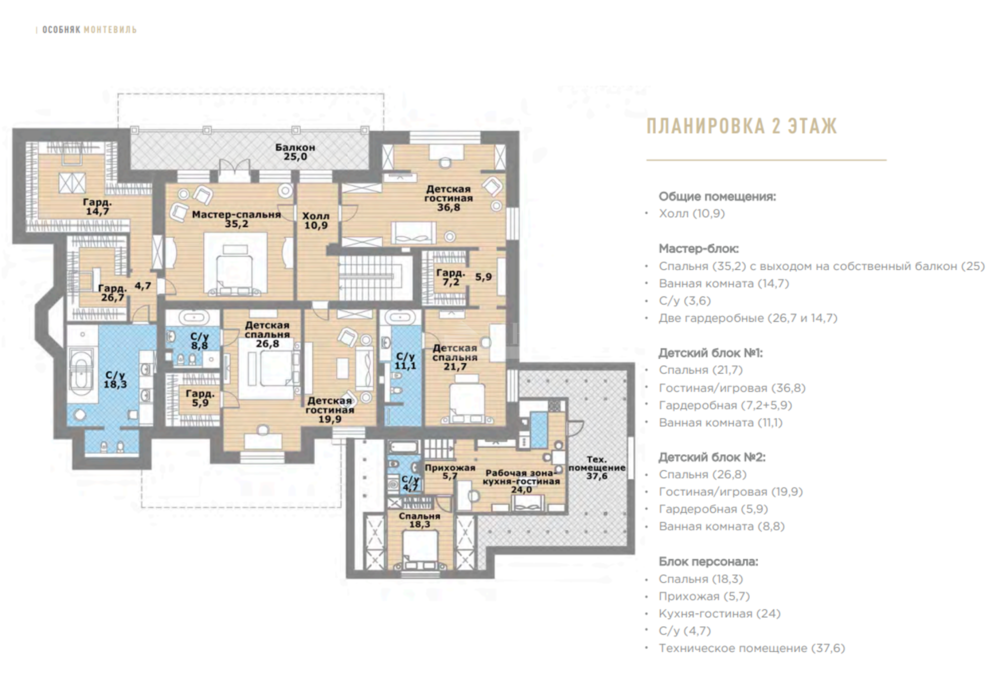 2й этаж: холл, спальня с выходом на балкон, ванная комната, с/у, две гардеробные, детская комната: гардеробная, ванная, игровая, еще один детский блок, блок для персонала;