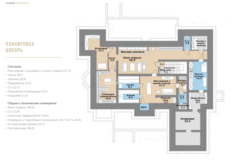цоколь: спа-зона: массажная с душевой и зоной отдыха, сауна, хаммам, раздевалка, с/у, подсобное помещение, кладовая, общие и технические помещения: зона отдыха, с/у, сезонная гардеробная, кладовые и подсобные помещения, холодильная камера, постирочная;