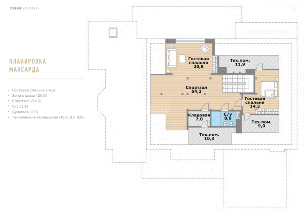 мансарда: гостевая спальня, зона отдыха, спортзал, с/у, душевая, техническое помещение.