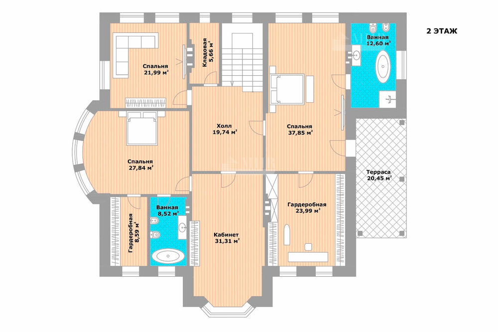 2-й этаж: мастер-спальня с ванной, гардеробной и выходом на террасу, мастер-спальня с ванной и гардеробной, 2 детские, кладовая, холл.