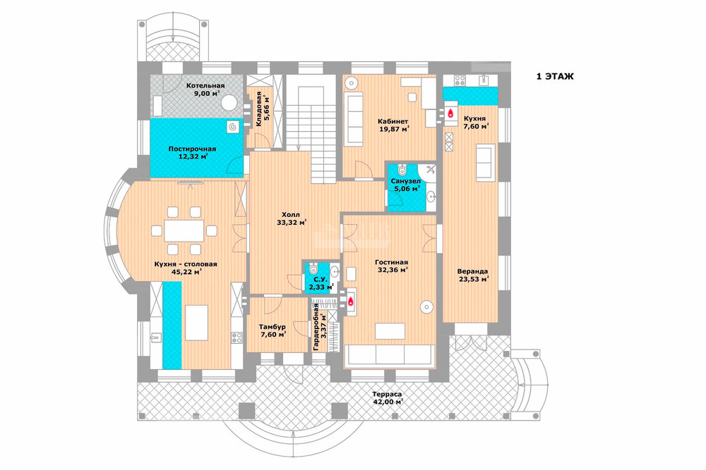 1-й этаж: тамбур, гардеробная, холл, кухня-столовая, гостиная с камином, спальня/кабинет, малая кухня с печью с верандой и выходом на террасу, с/у, постирочная, котельная, кладовая;