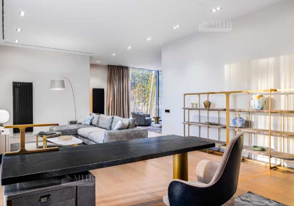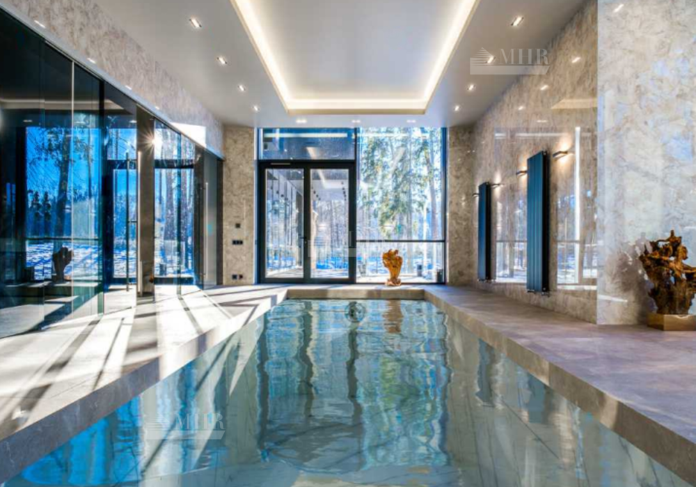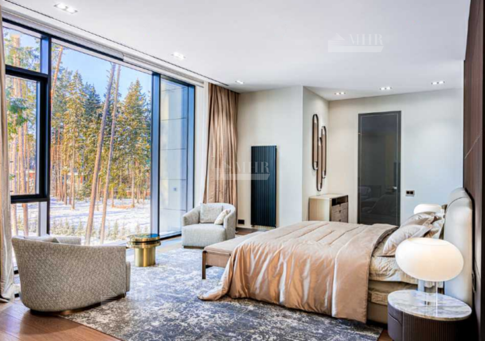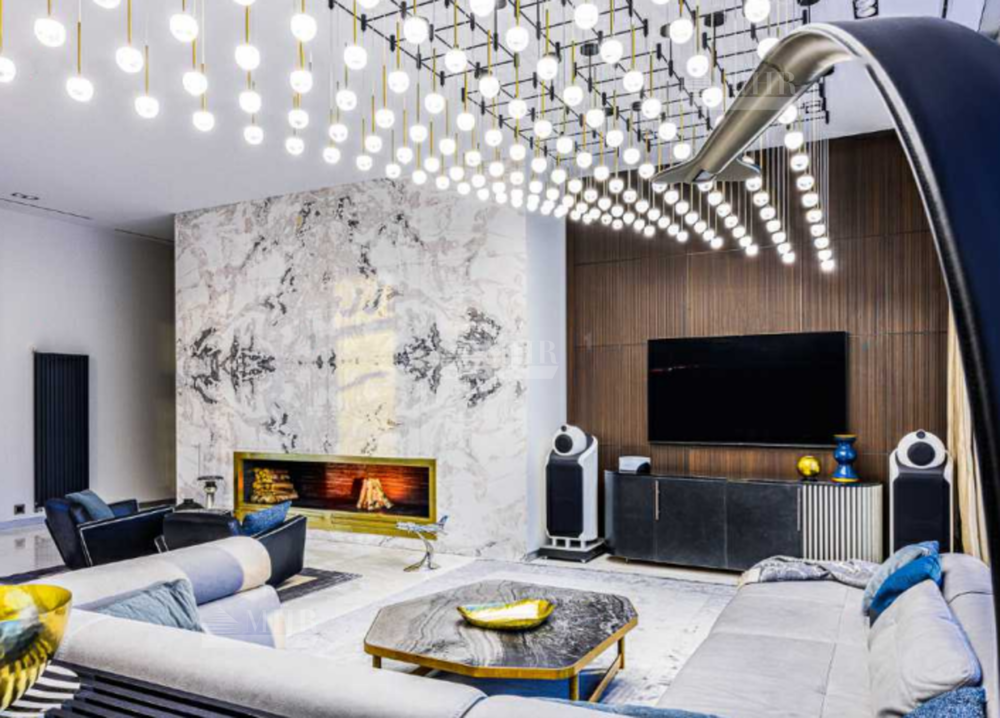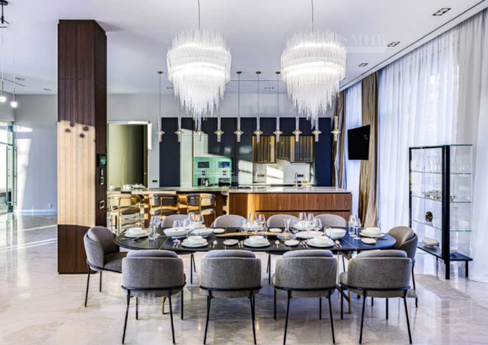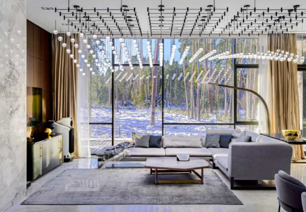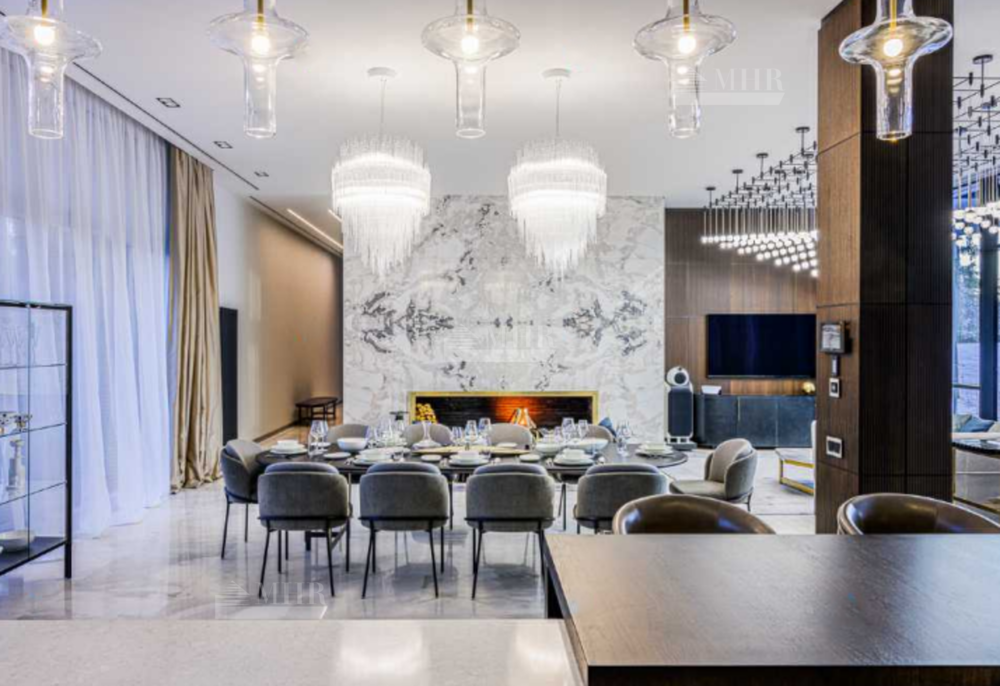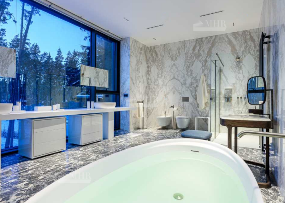 обставлен мебелью и аксессуарами ведущих мировых брендов Porada, Minotti, Baxter, Rugiano, Ulivi, Ipe cavalla, Bosa, Fiam, Tom Dixon. Санузлы оборудованы сантехникой Duravit, Fir, Cea Design, Antonio Lupi, кухня Siematic – бытовой техникой GAGGENAU. В доме установлен эффектный стеклянный лифт. В отделке использованы самые лучшие материалы: натуральный мрамор, керамогранит GRANITI FIANDRE, дубовый паркет, оконные системы SCHUCCO, двери RIMADESIO. Фасад облицован клинкером от JANINHOFF. Домовладение находится в КП «Сады Майендорф» (территория санатория Барвиха) – одном из наиболее престижных коттеджных посёлков Рублёвки. Здесь