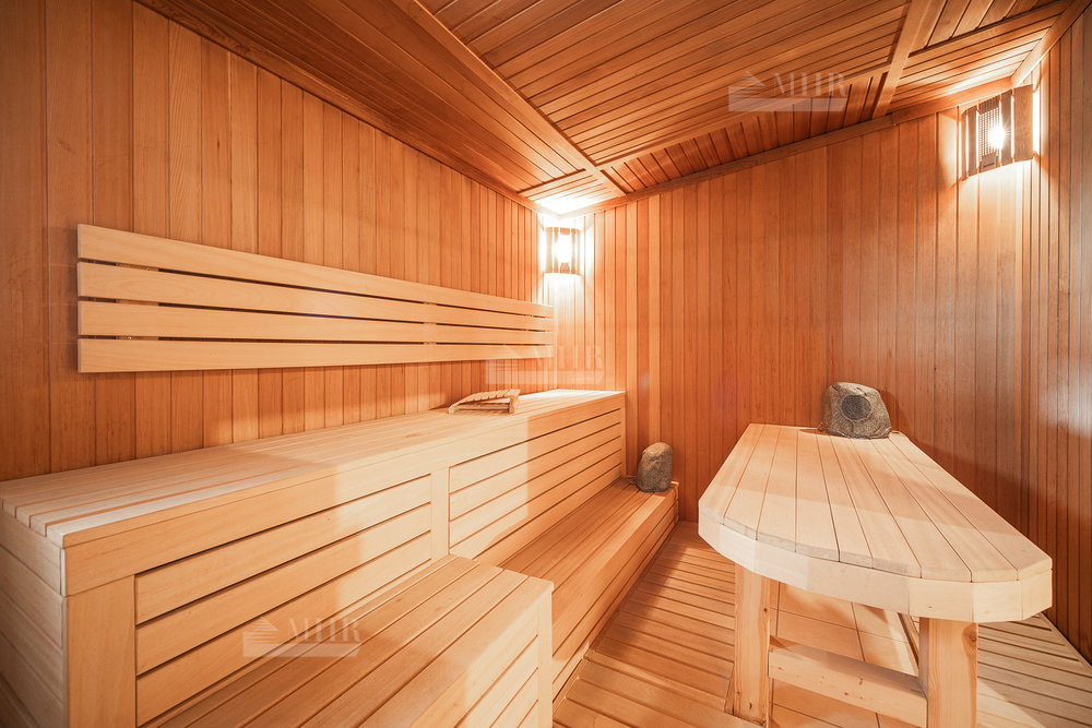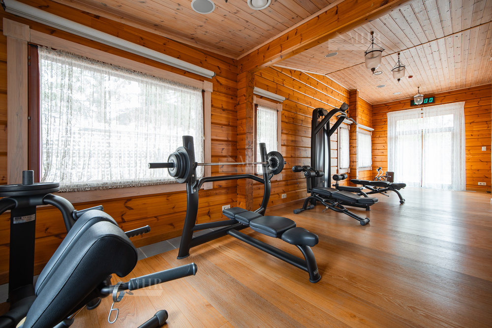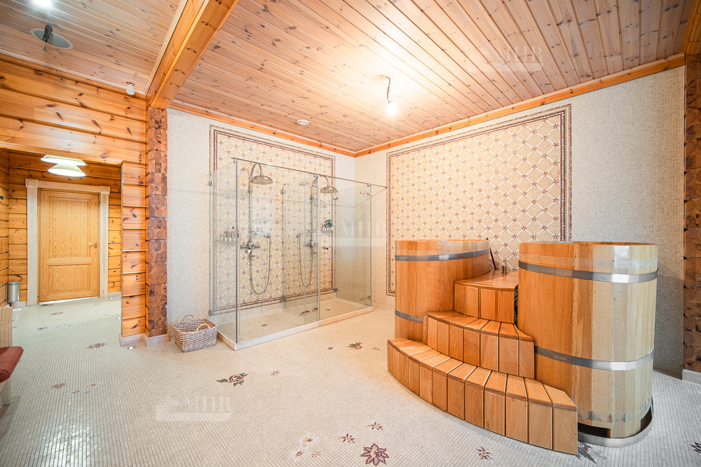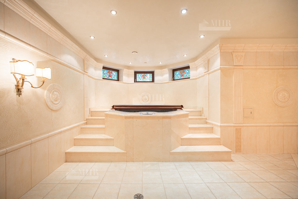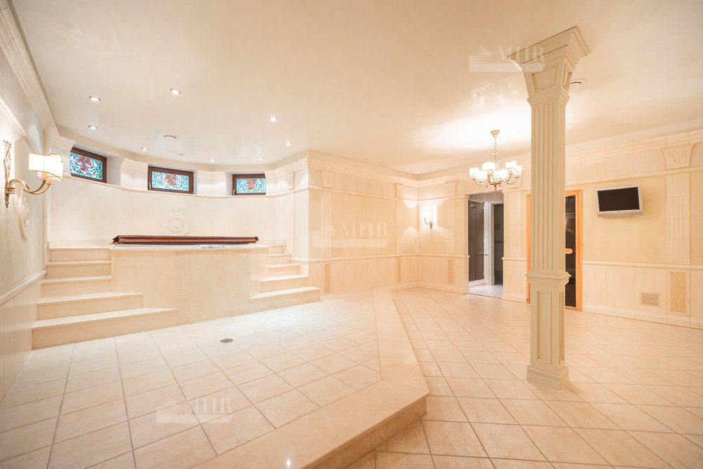 На участке расположен отдельно стоящий банный комплекс с бассейном и зоной СПА, уютной гостиной с дизайнерским камином, спортзалом, хаммамом и русской баней.