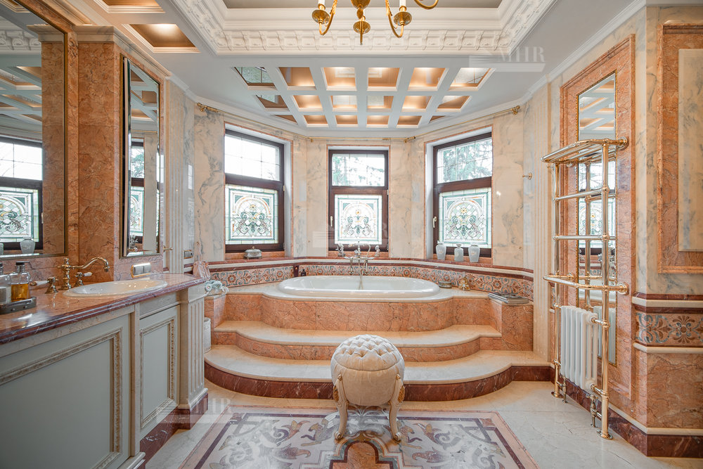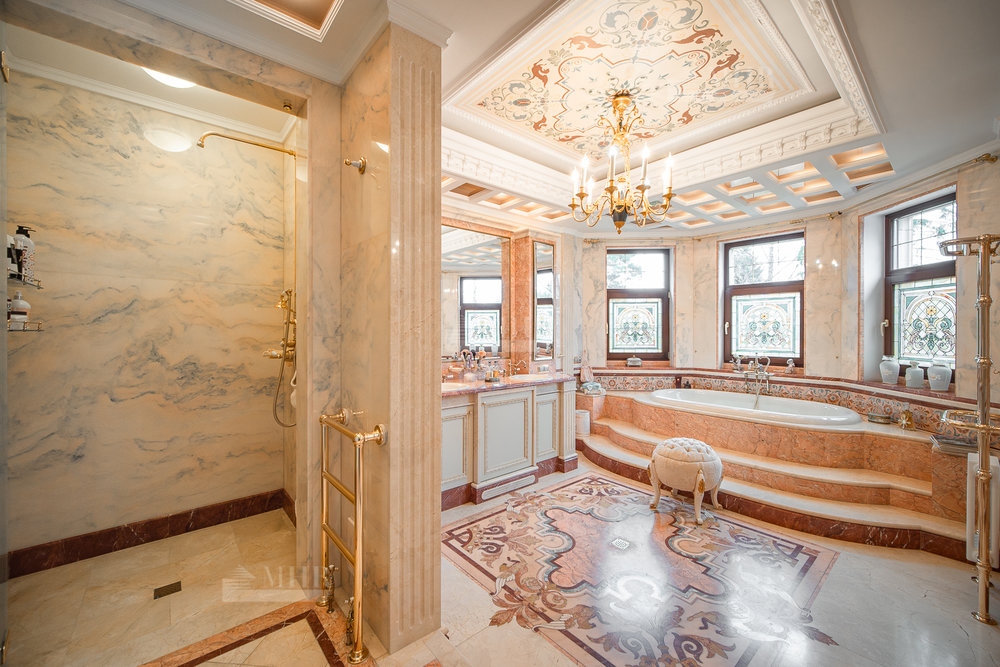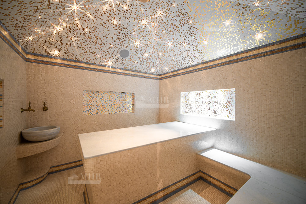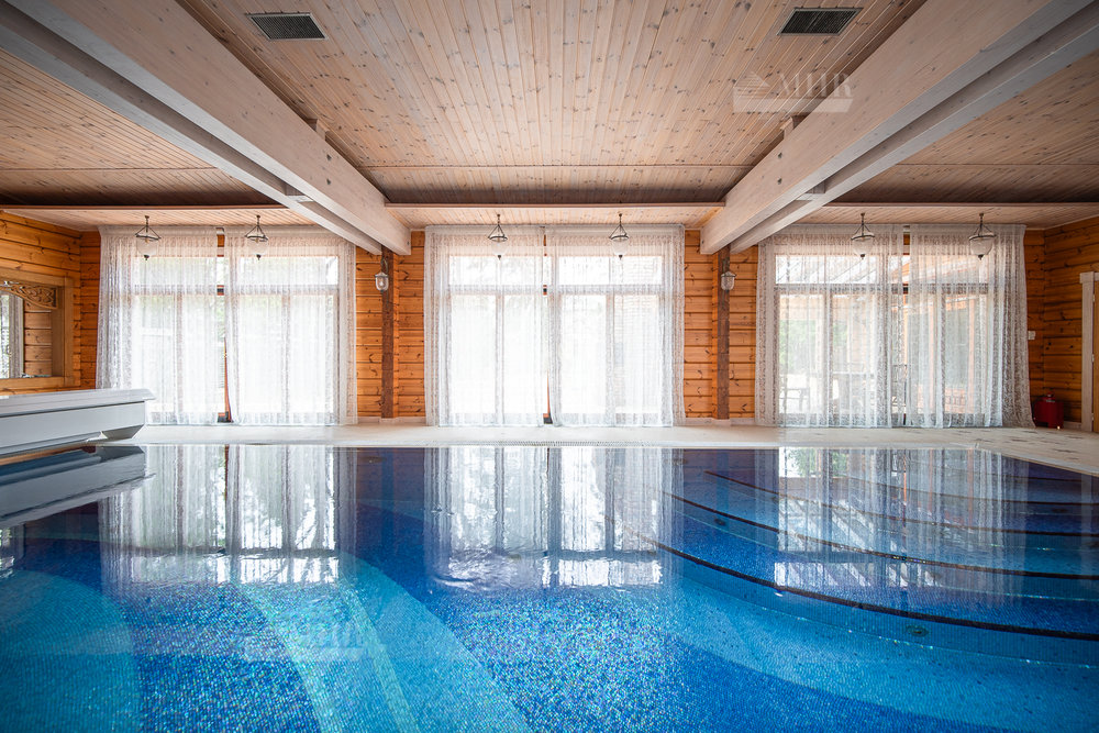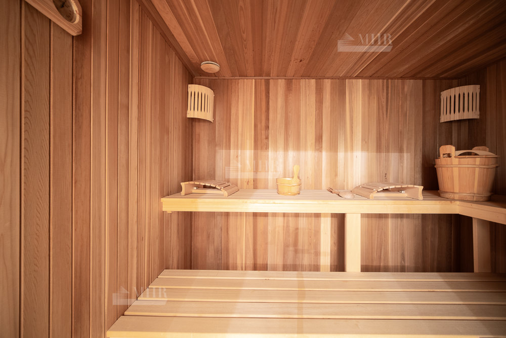 На участке расположен отдельно стоящий банный комплекс с бассейном и зоной СПА, уютной гостиной с дизайнерским камином, спортзалом, хаммамом и русской баней.