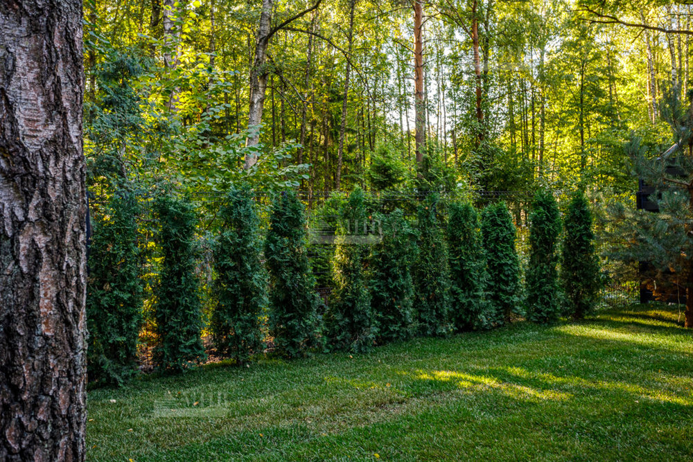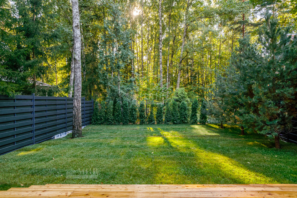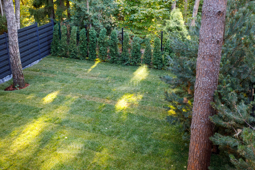 Участок расположен на ровной местности с устойчивым, спокойным рельефом- это создаёт ощущение простора и гармонии в окружающем ландшафте. На всём участке высажен газон, который подчёркивает чистоту и аккуратность территории, создавая ощущение открытого и зелёного пространства.
