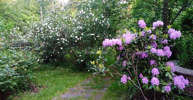 Участок огорожен деревянным забором, организовано два входа, одни ворота. На участке высажены крупномеры- ели и сосны. Оборудовано крытое место для парковки двух автомобилей.