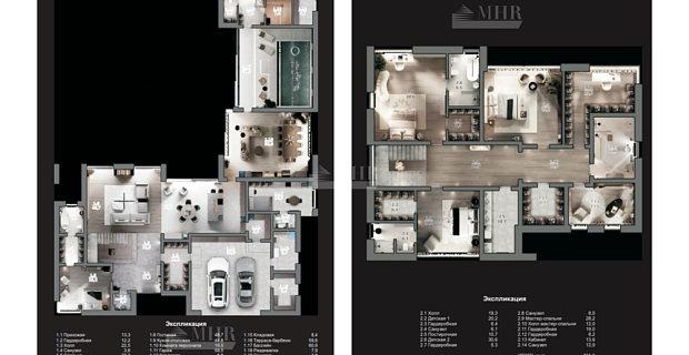 1-й этаж: холл, гардеробная, с/у, кухня/столовая с выходом на террасу, гостиная, кладовая, постирочная, бойлерная;