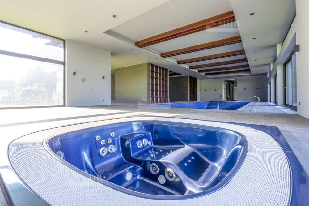 На первом этаже гостиная, столовая, кухня с выходами на большую террасу, малая гостиная, кабинет, гостевой санузел, прачечная, две комнаты для хознужд, гостевая зона с тремя спальнями и двумя санузлами, а также большая спа-зона: 15-метровый бассейн, бассейн с холодной водой, джакузи, паровая кабина, сауна, солевая комната, тренажерный зал, два санузла.
