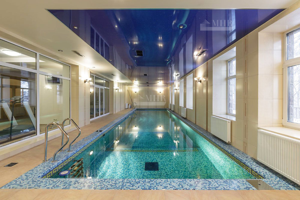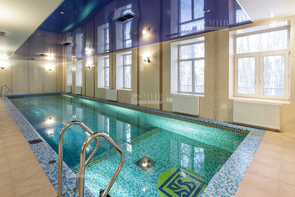 Цоколь (1 уровень): гараж на 3 машины с антресолью, фитнес-зона: бассейн 15,5 х4,5, тренажерный зал, сауна, душевая, с/у, лифт;