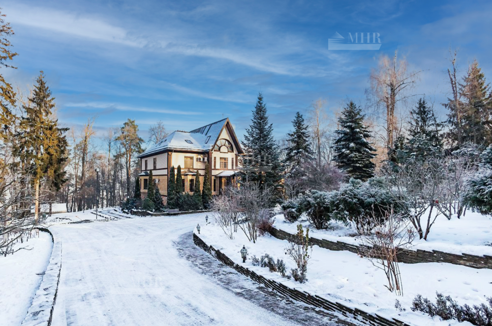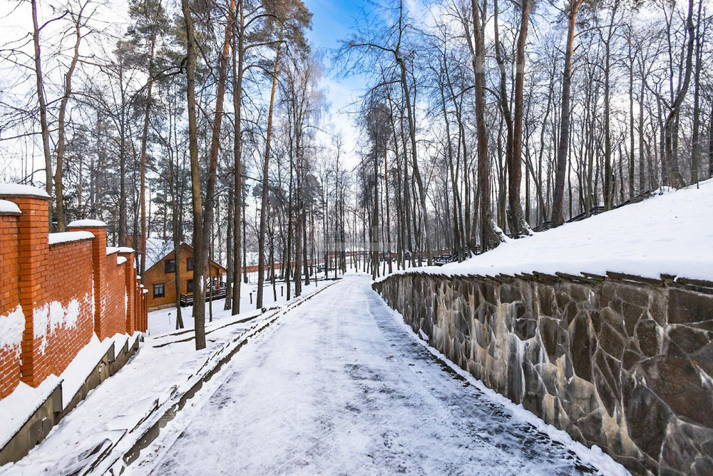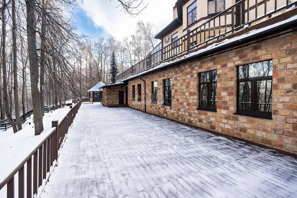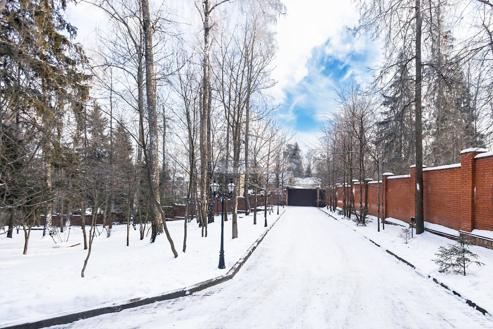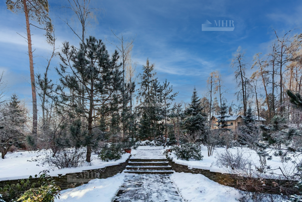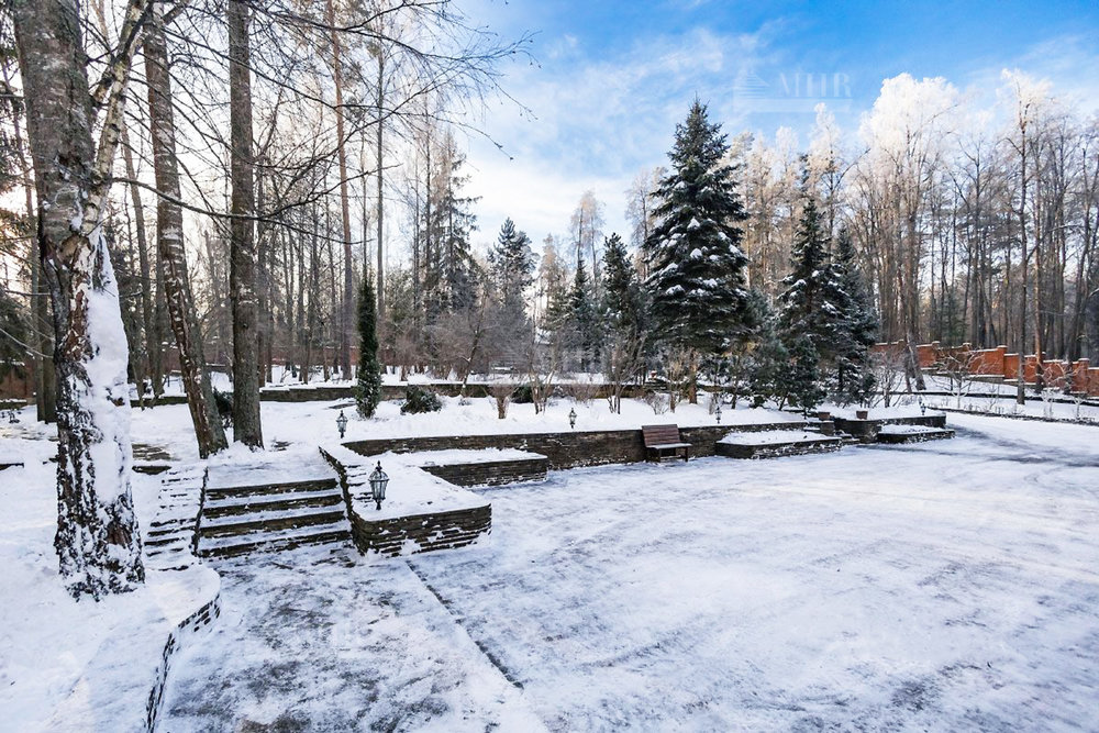 Шикарный рельефный участок в окружении леса с ландшафтным дизайном и дорожками для прогулок, теннисным кортом, сад с плодоносящими деревьями и теплица, вольер для собак. По периметру территории кирпичный забор, установлены камеры видеонаблюдения.