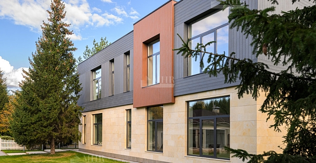 Отделка фасада комбинированная, выполнена из португальского известняка и ангольского гранита, деревянные стеклопакеты Siegenia. Применены новейшие решения по инженерным системам: приточная вентиляция во все помещения, канальные кондиционеры Daikin во всех помещениях, котельная и системы отопления немецкие Buderus, Meibes; системы теплых полов и конвекторного отопления, молниезащита и бесшовный wi-fi по всему участку.