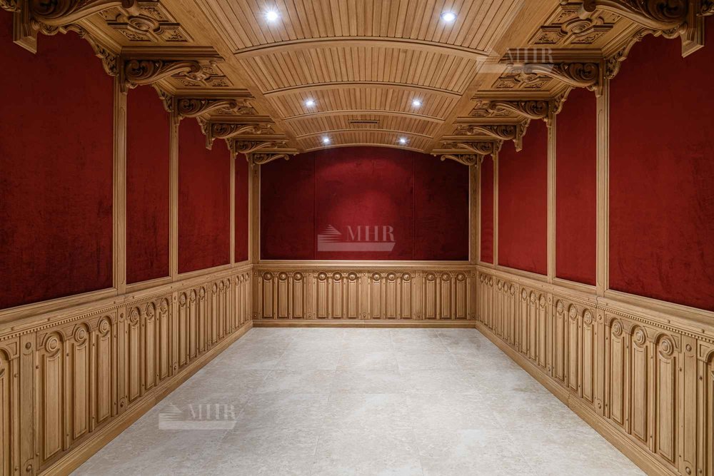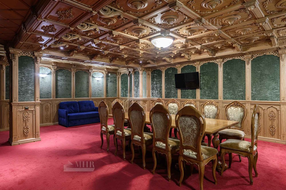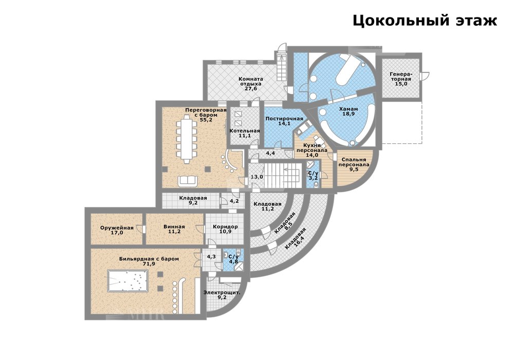 цоколь: бильярдная с баром, переговорная, винное хранилище, хаммам с комнатой отдыха, гостевой с/у; блок для персонала: с/у, кухня, спальня; постирочная, оружейая, кладовые, генераторная, котельная;