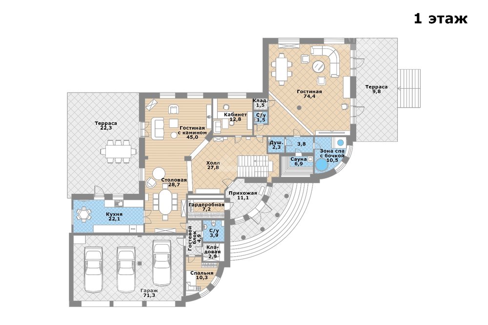 1й этаж: прихожая, гардербная, холл, каминный зал, столовая, кухня, гостиная, кабинет, гостевой с/у, спа-зона, саун с душевой, гараж на 3 м/м, гостевой блок со спальней, с/у, гардербной;