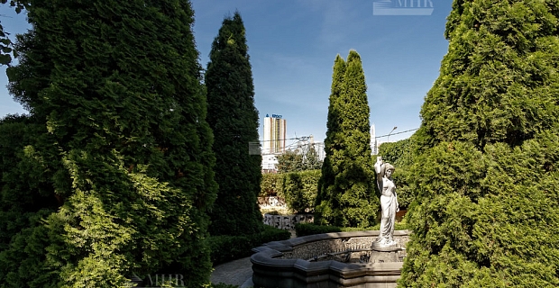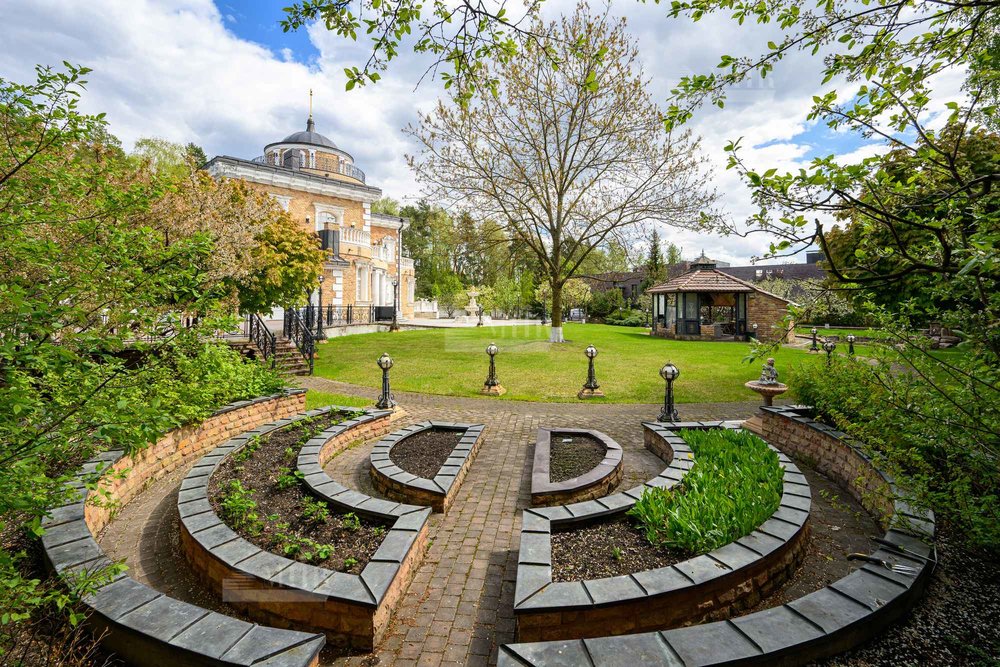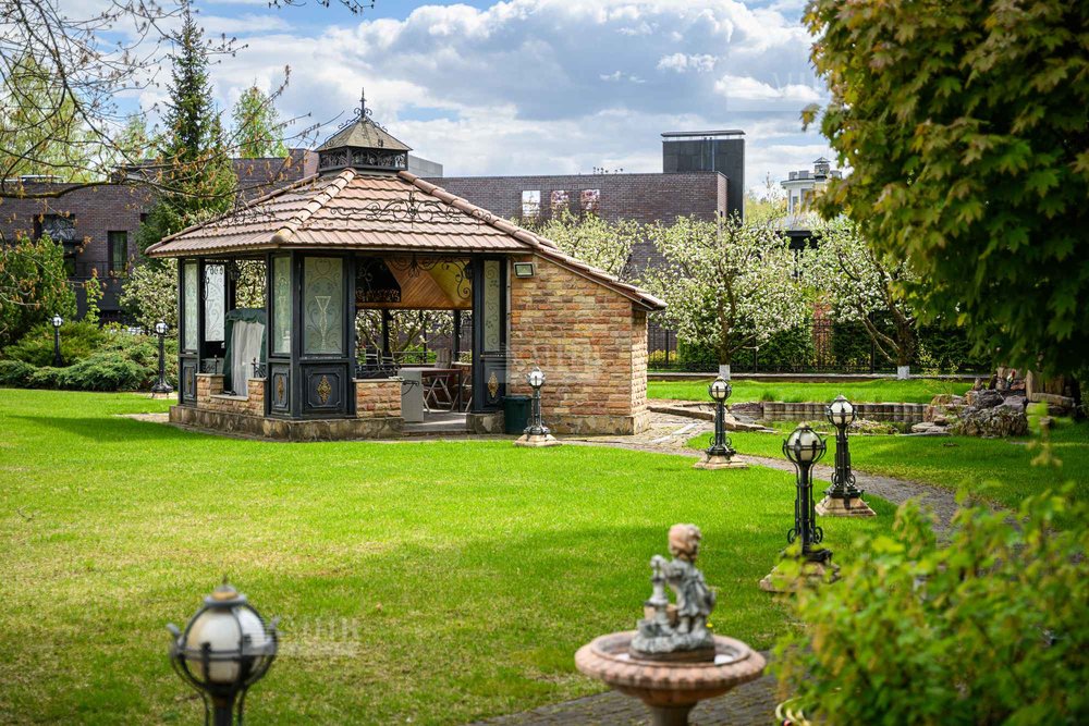 Резиденция стоит на участке с ровным рельефом и живописным ландшафтным дизайном в парковом стиле. На территории установлена беседка с мангалом, фонтан у въезда, сад камней с водопадом и фигурами ангелов, обустроены зоны современных грядок.