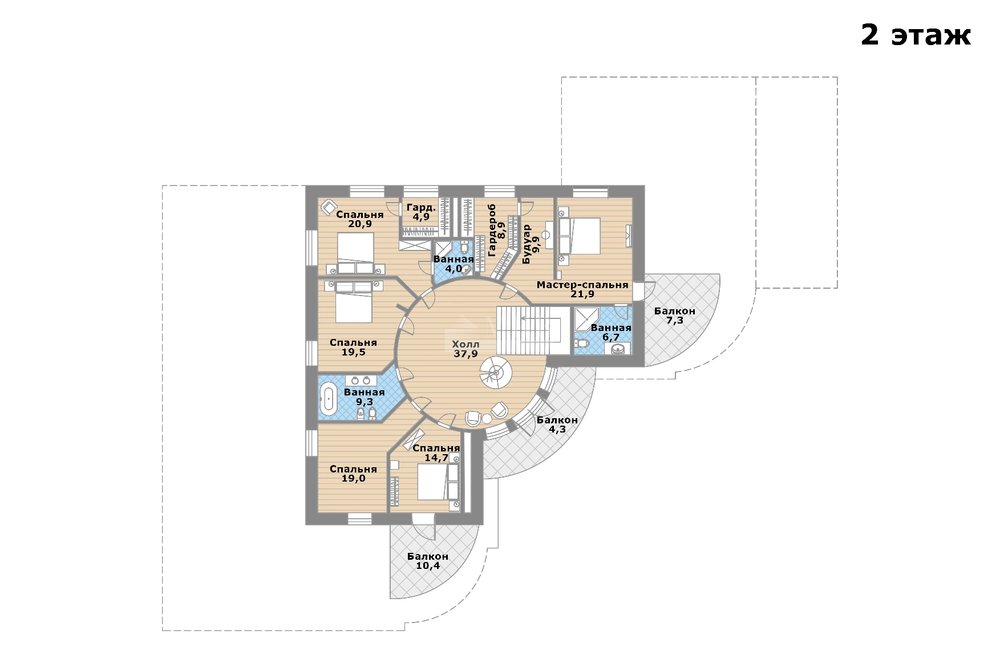 2й этаж: холл, балкон, масте-спальня с гардеробной, ванной и балконом, спальня с гардеробной и ванной комнатой, 3 детких, балкон;