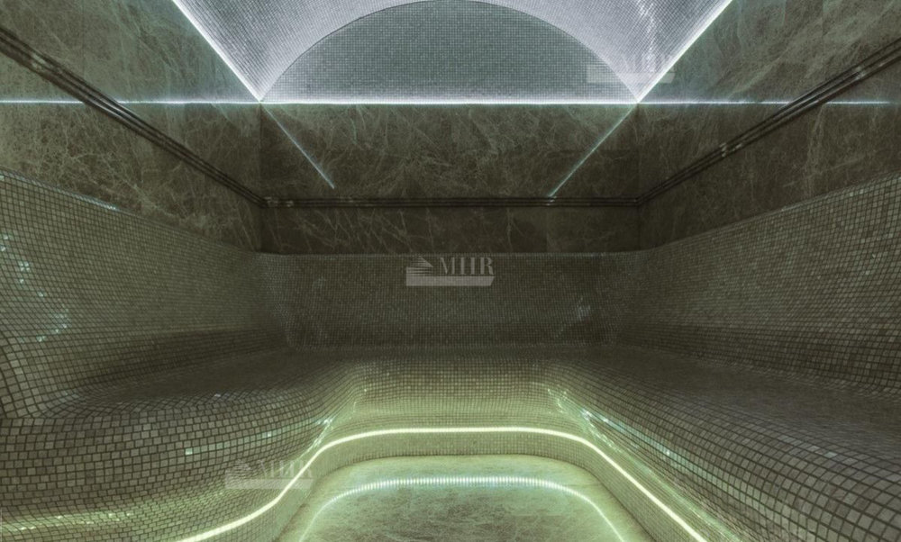 1 этаж: бассейн, гардеробная, гостиная, душевая, кабинет, комната отдыха, кухня, прихожая, санузел - 2шт., сауна, СПА-комплекс, спальня с гардеробной и санузлом, столовая, терраса, хамам, холл.