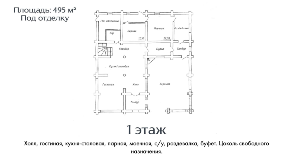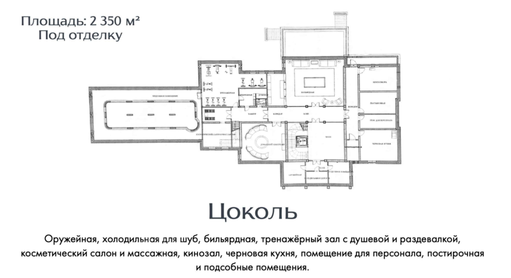 Цоколь - оружейная, холодильная для шуб, бильярдная, тренажерный зал с душевыми, раздевалкой, косметическим салоном, массажной комнатой. Кинозал. Черновая кухня. Помещение для персонала. Постирочная и сушильная. Подсобные помещения.