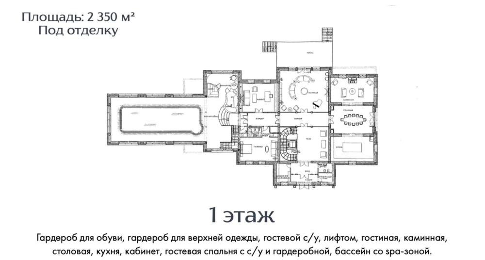 1 этаж - гардероб для верхней одежды, гардероб для обуви, гостевой с/у, гостиная, каминная, кухня-столовая, кабинет, гостевая спальня с гардеробом и с/у, большой бассейн со SPA-зоной, лифт