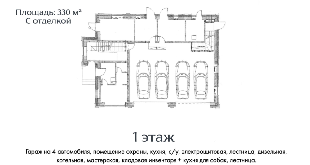1 этаж - гараж на 4 автомобиля, помещение охраны, кухня, с/у, электрощитовая дизельная, котельная, мастерская, кладовая инвентаря, кухня для собак.