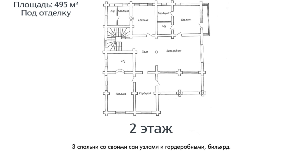 2 этаж - три спальни со своими гардеробными и с/у, холл, бильярд.