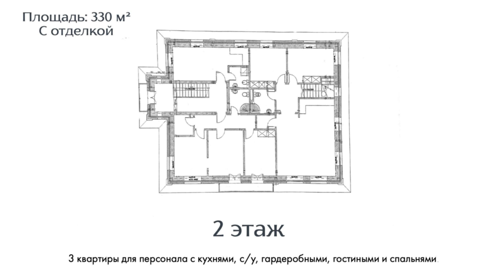 2 этаж - три квартиры с кухнями, с с/у, гардеробными, гостиными и спальнями.