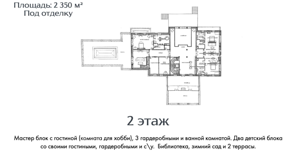 2 этаж - мастер блок с гостиной (комната для хобби) тремя гардеробными и с/у, два детских блока со своими гостиными, гардеробными, комнатой для хранения игрушек и с/у. Библиотека. Зимний сад. Две террасы.