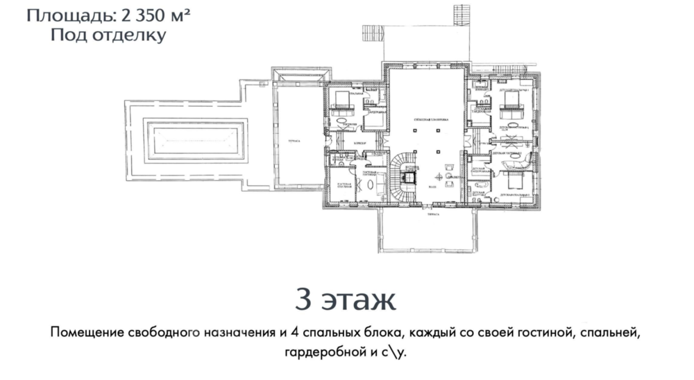 3 этаж - четыре спальных блока каждый со своей гостиной, спальней, гардеробом и с/у, помещение свободного назначения.