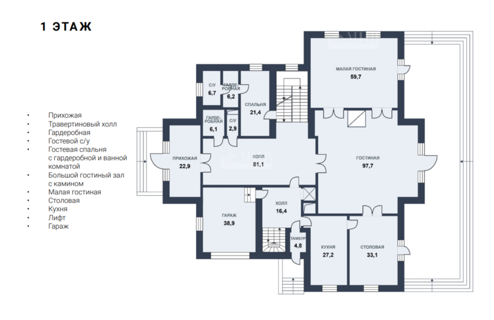 1-й этаж: прихожая, травертиновый холл, гардеробная, гостевой с/у, гостевая спальня с гардеробной и ванной комнатой, большой гостиный зал с камином, малая гостиная, столовая, кухня, лифт, гараж;