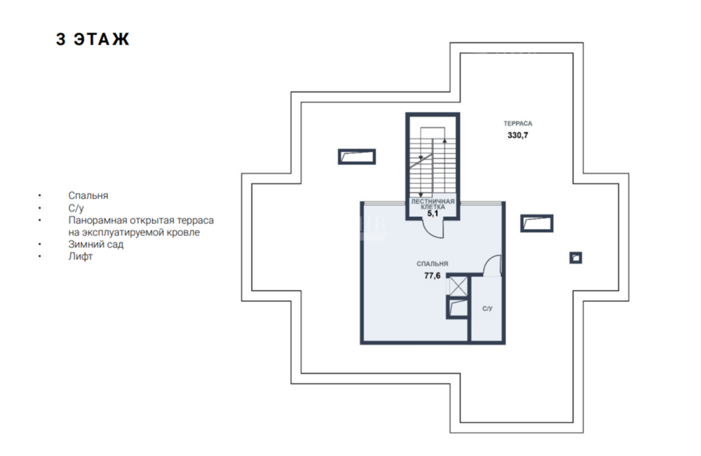 3-й этаж: спальня, с/у, панорамная открытая терраса на эксплуатируемой кровле, зимний сад, лифт.
