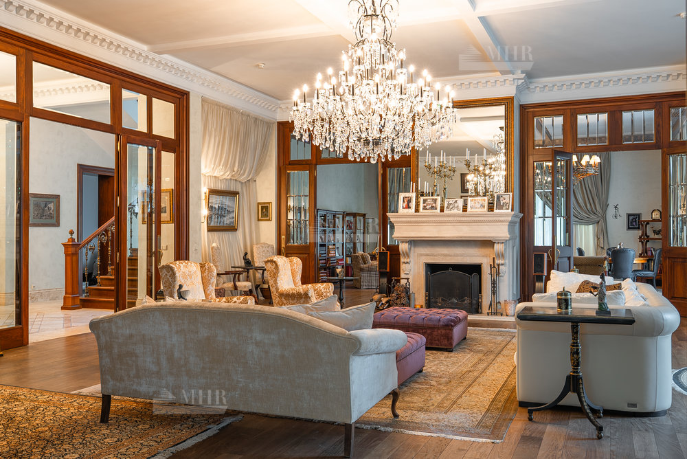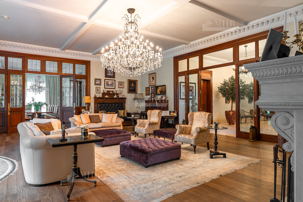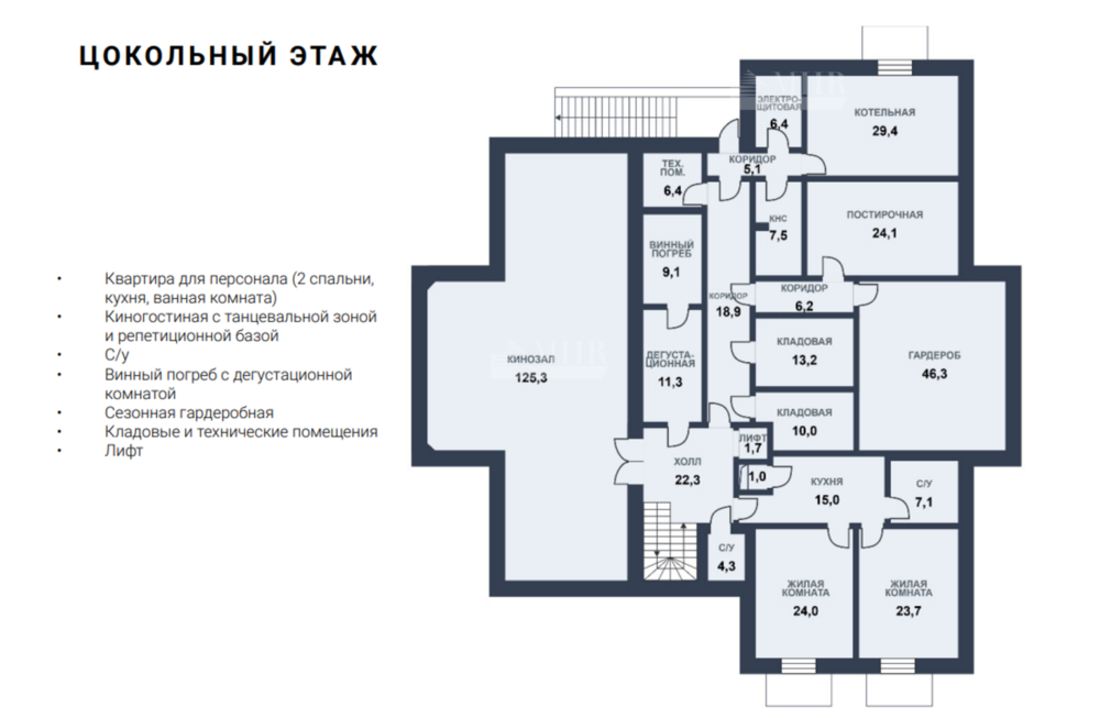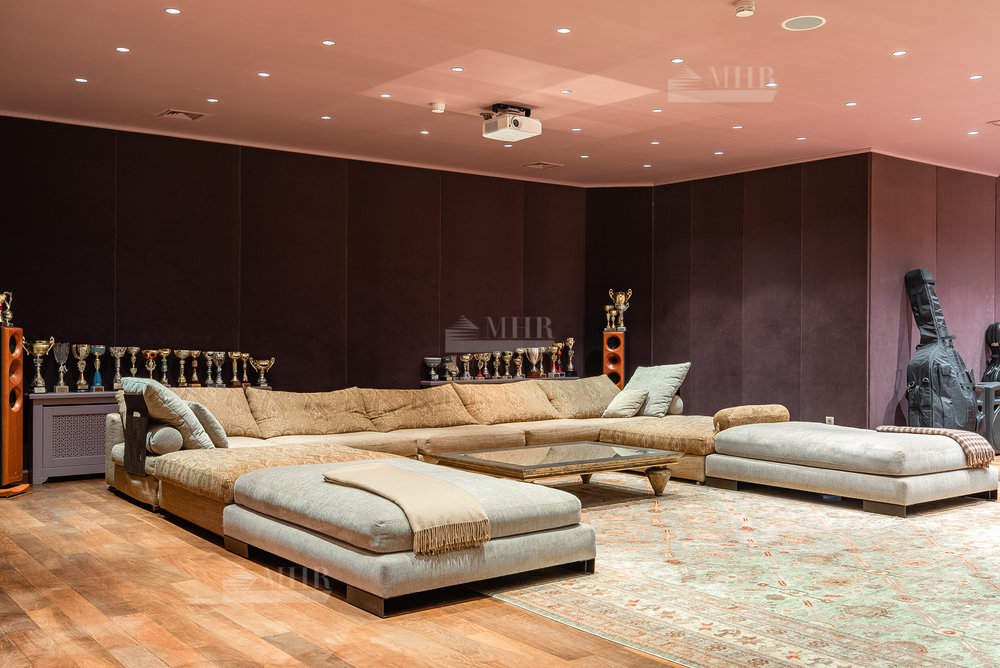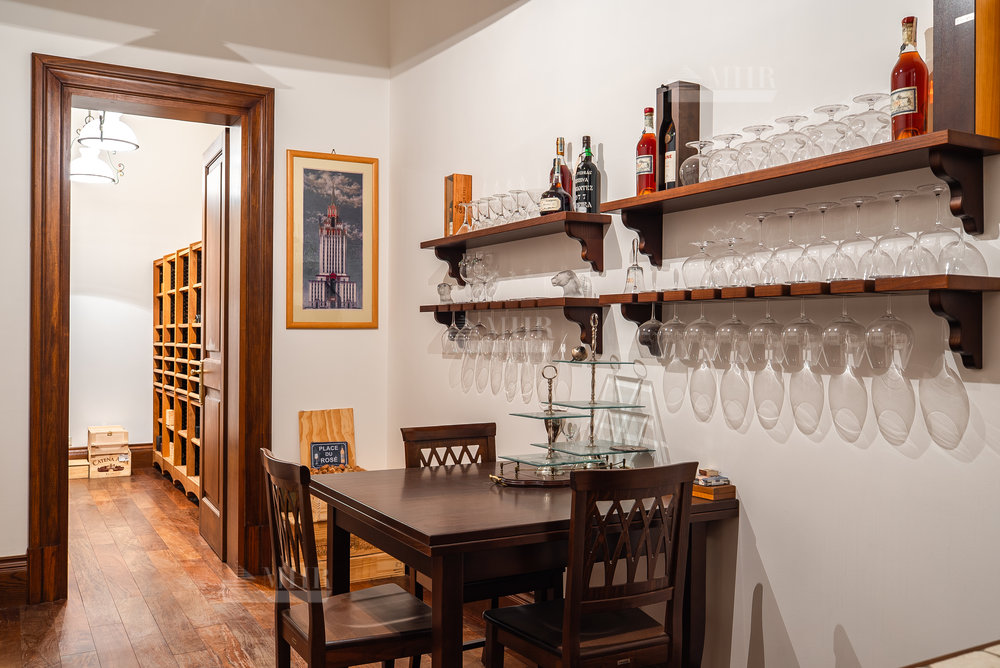 Цоколь: квартира для персонала (2 спальни, кухня, ванная комната), киногостиная с танцевальной зоной и репетиционной базой, с/у, винный погреб с дегустационной комнатой, сезонная гардеробная, кладовые и технические помещения, лифт.