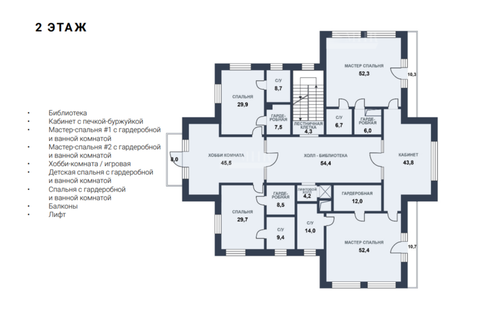 2-й этаж: библиотека, кабинет, 2 мастер- спальни с гардеробной и ванной комнатой, хобби-комната/игровая, детская спальня с гардеробной и ванной комнатой, спальня с гардеробной и ванной комнатой, балконы, лифт;