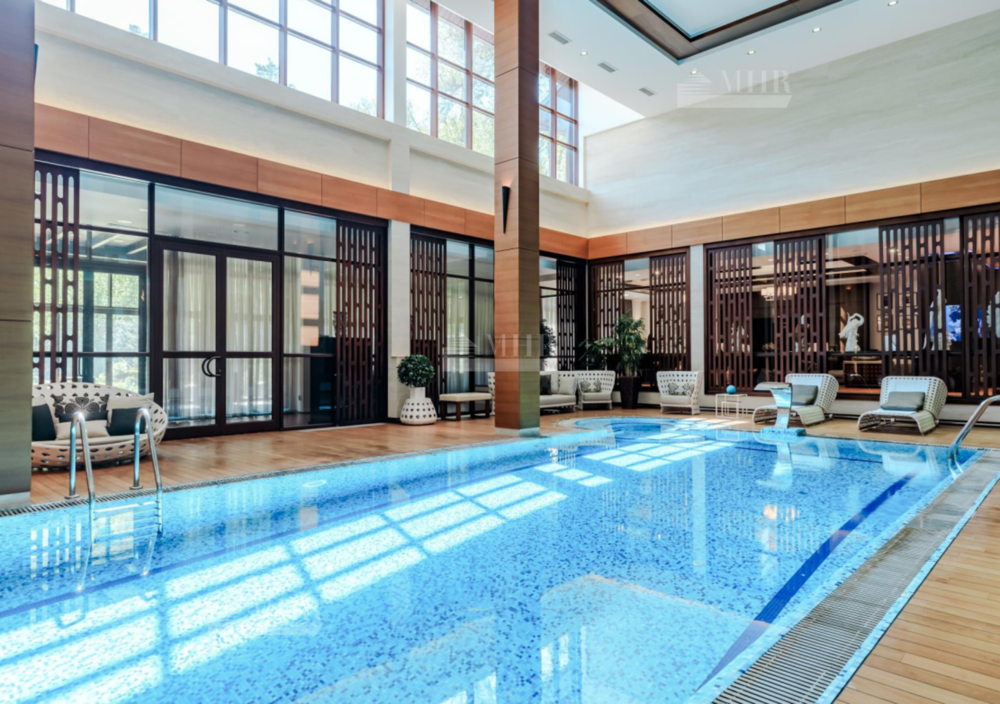 Особая гордость дома- шикарная СПА-зона с великолепным бассейном и сауной. Предусмотрен встроенный гараж для двух автомобилей. Установлены системы видеонаблюдения и сигнализации, есть помещение для охраны. На придомовой территории 20 соток выполнен превосходный ландшафтный дизайн с прудом и зоной отдыха.