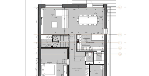 1-й этаж: прихожая, гардеробная, гостевой с/у с душевой, кухня-столовая с выходом на летнюю террасу, гостиная с камином, комната/кабинет, постирочная, гараж на 2 м/м, котельная с отдельным входом, блок для персонала;