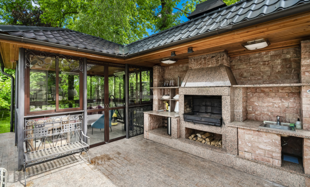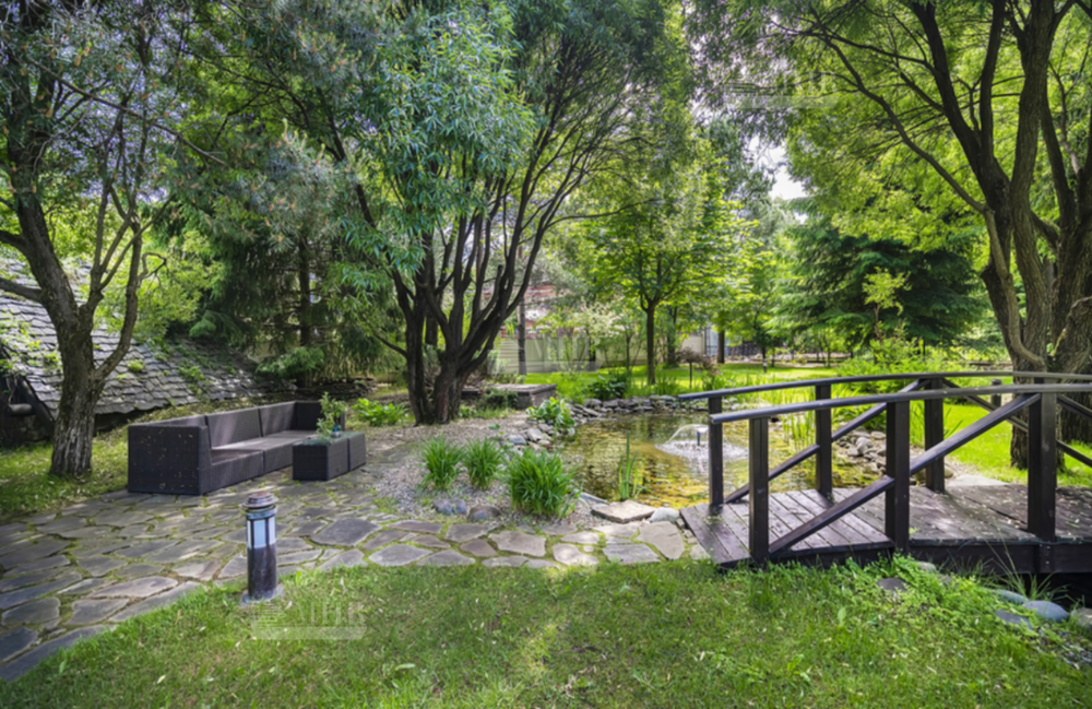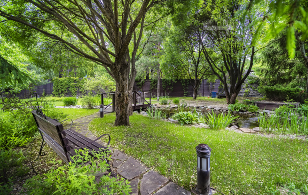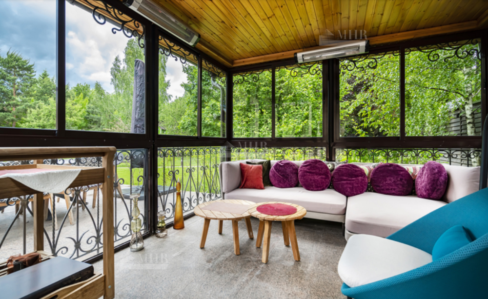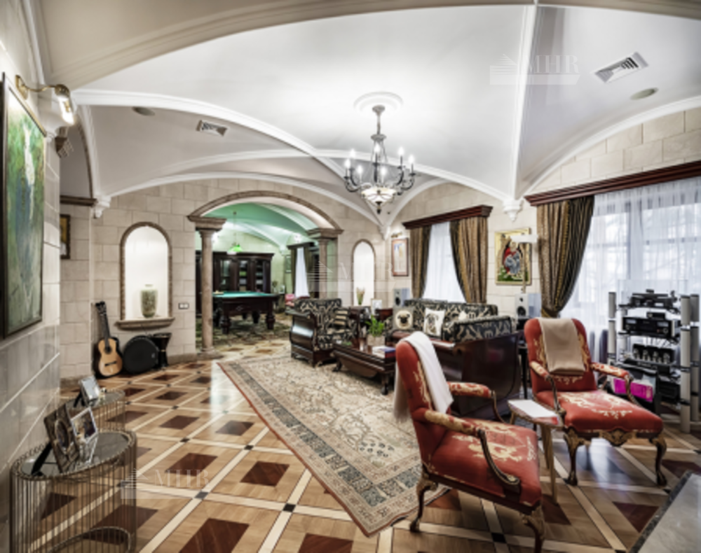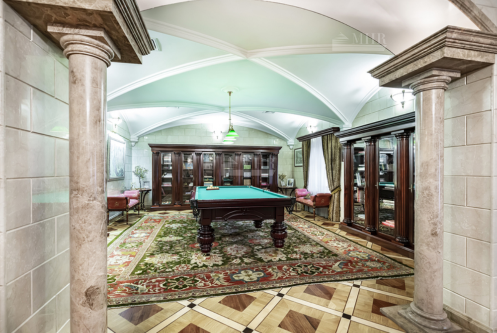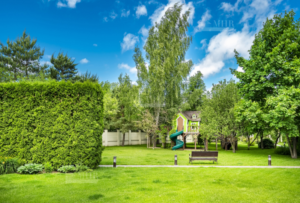 На участке: дом для охраны, закрытая беседка барбекю, гостевой дом с тренажерным залом, спальней и с/у, гараж на 3 м/м с двухкомнатной квартирой для персонала, детский игровой домик, водоем.