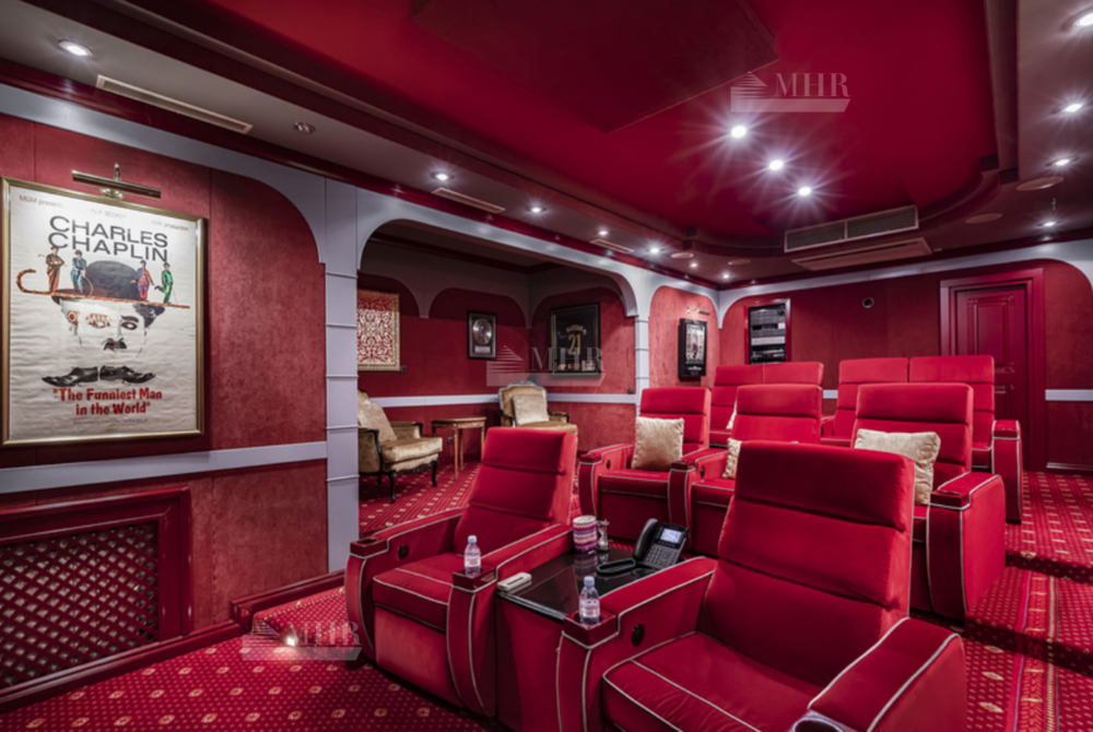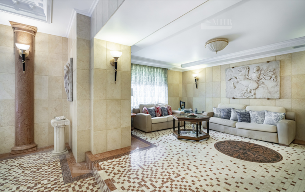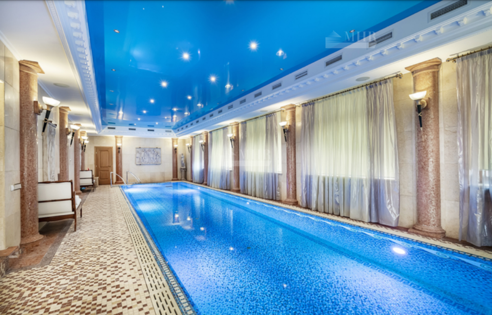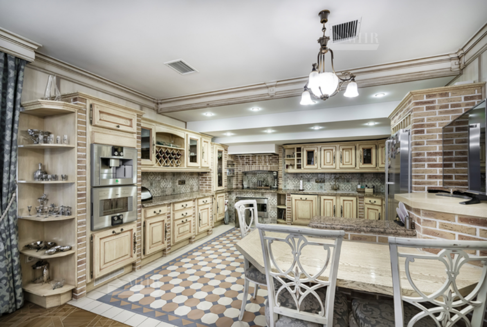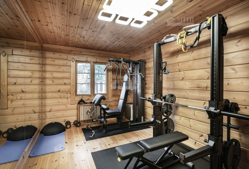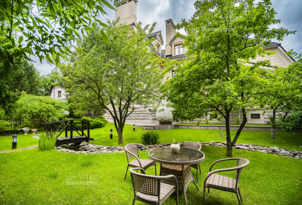 На участке: дом для охраны, закрытая беседка барбекю, гостевой дом с тренажерным залом, спальней и с/у, гараж на 3 м/м с двухкомнатной квартирой для персонала, детский игровой домик, водоем.
