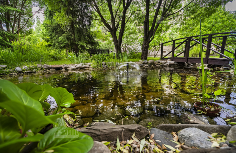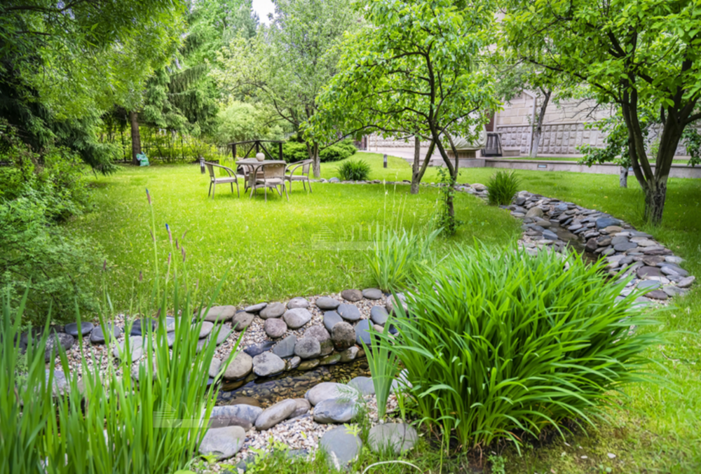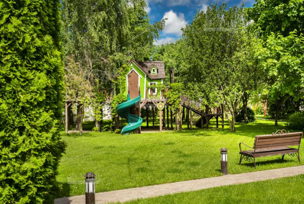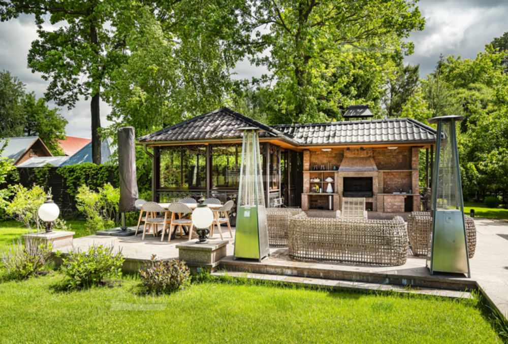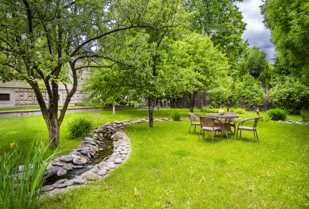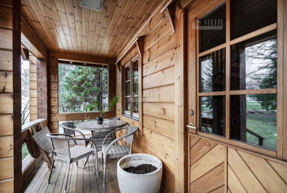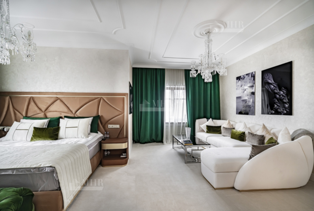 На участке: дом для охраны, закрытая беседка барбекю, гостевой дом с тренажерным залом, спальней и с/у, гараж на 3 м/м с двухкомнатной квартирой для персонала, детский игровой домик, водоем.