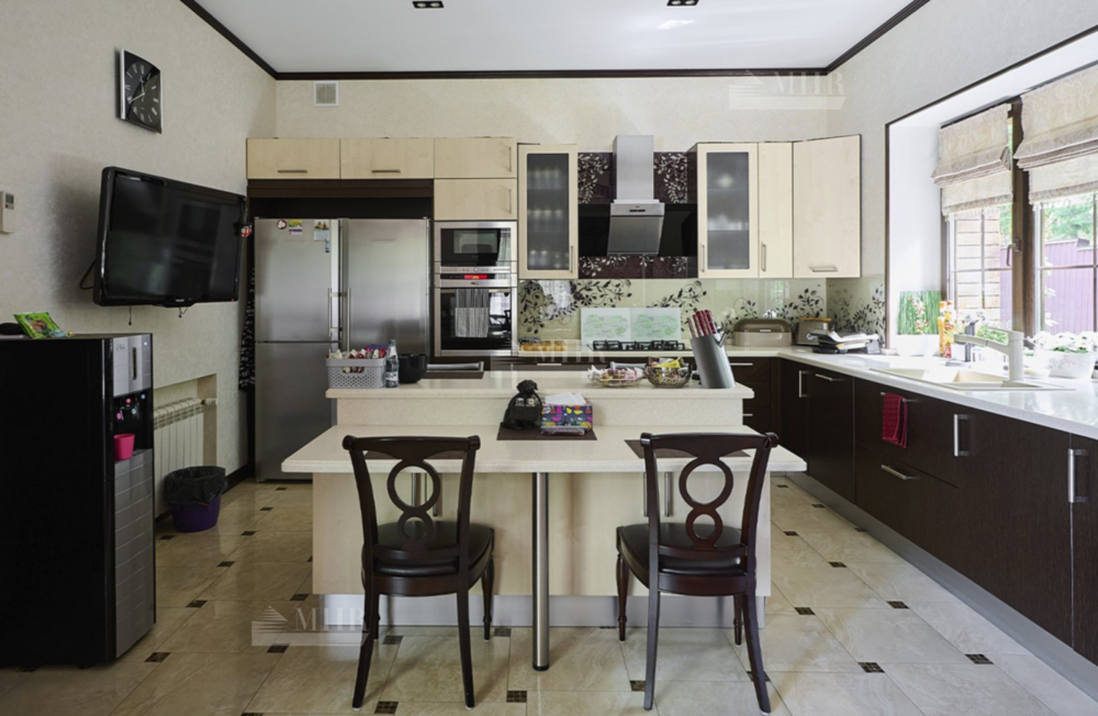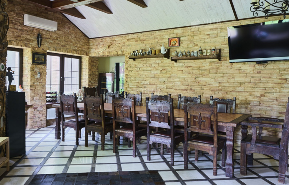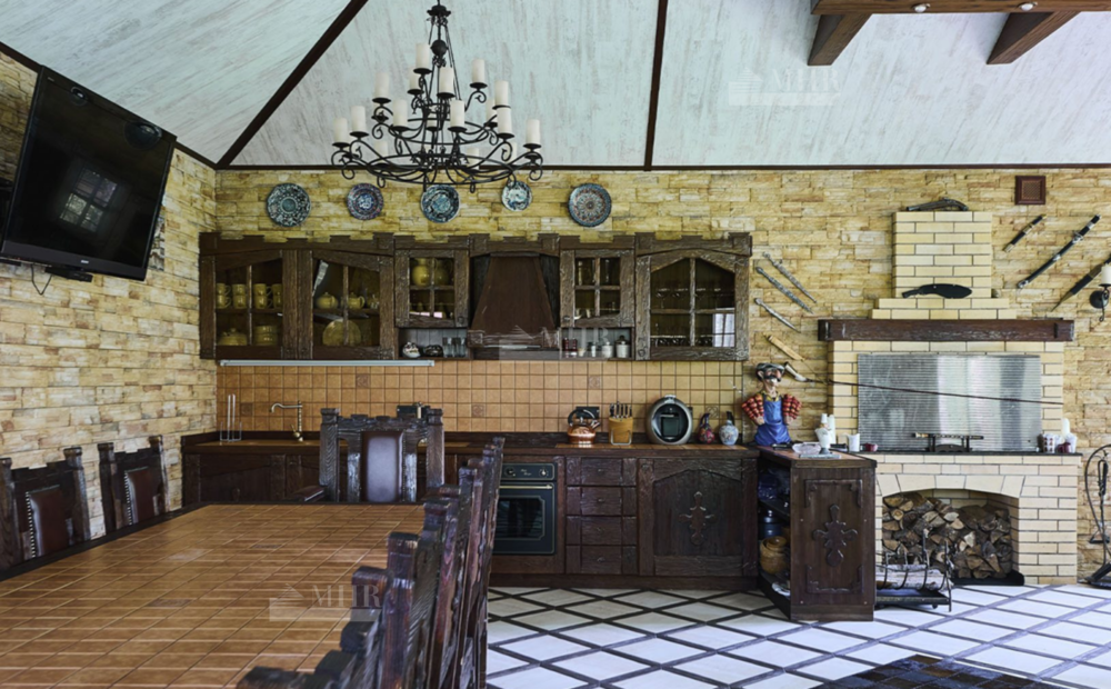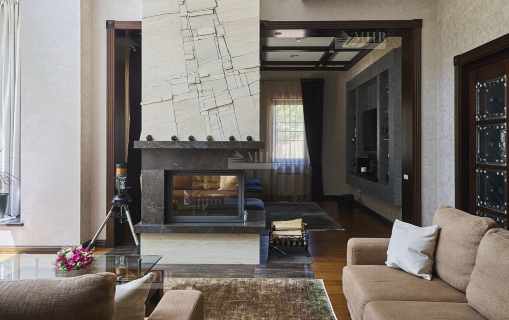 2-й этаж: просторная гостиная с двухсторонним камином, кухня-столовая, 7 спален.