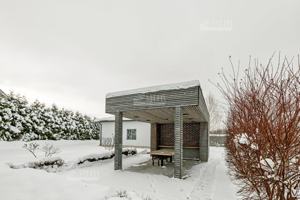 На участке выполнен красивый ландшафтный дизайн, растут крупномеры и кустарники. Есть беседка, барбекю и гостевой дом/для персонала( 2 кухни, 2 спальни, с/у).