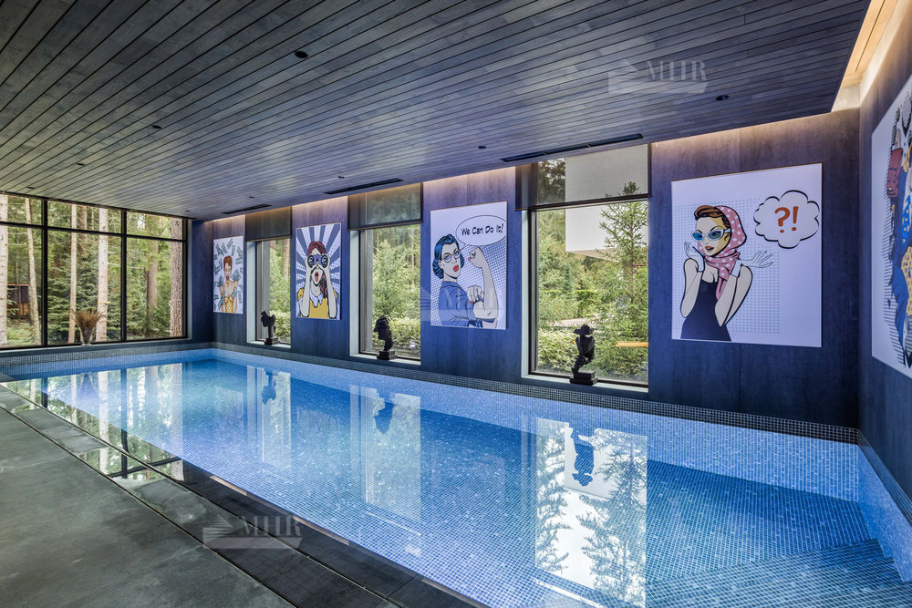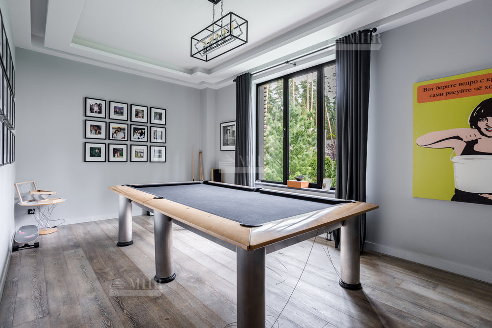 1 этаж: гостиная с камином, кухня- столовая с выходом на террасу. В отдельном крыле расположены: бильярдная, бассейн 80 кв.м,  хаммам, гардеробная., санузел, прачечная, гараж на 2 машины.