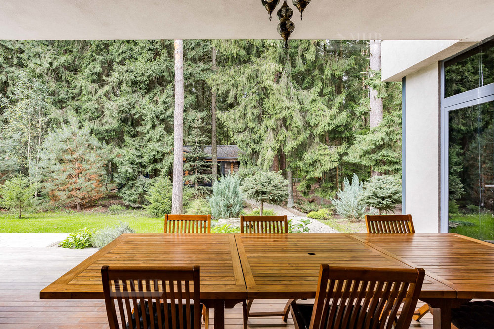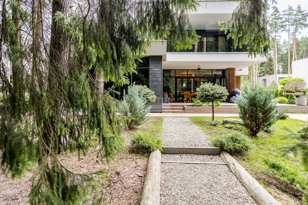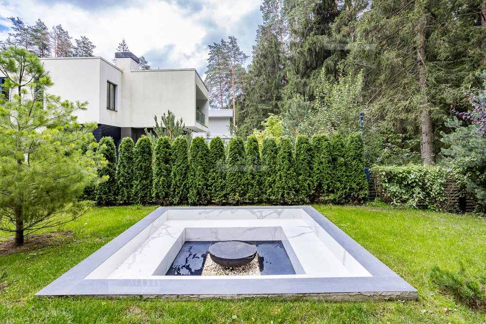 Шикарный лесной  участок с вековыми соснами и елями, с ландшафтным дизайном: туи, высеян газон, установлены декоративные элементы, освещение, дорожки, территория  благоустроена — естественный лесной ландшафт. Зона патио с костром и устройством ливневых стоков. Дополнительные места для парковки на 2 машины.